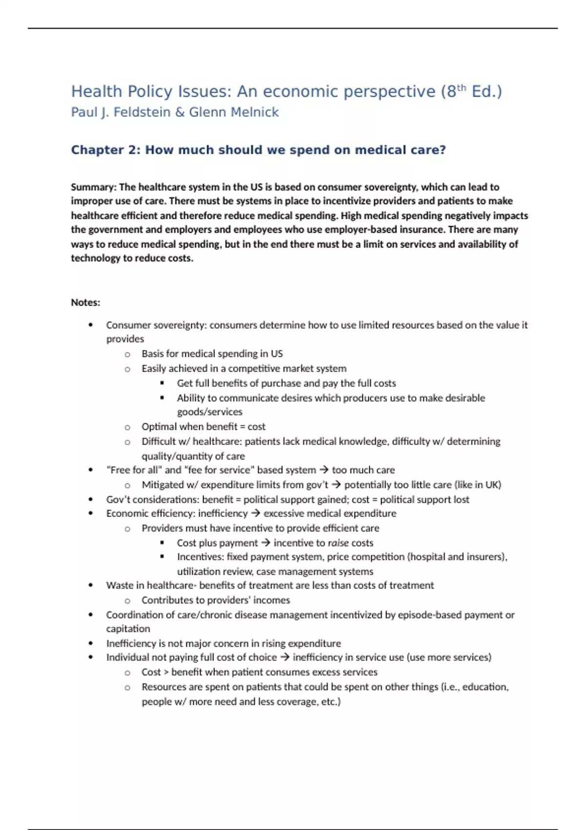 This document provides a summary and notes on chapter 2 of "Health Policy Issues: an Economic Perspective, Eighth Edition" by Paul J. Feinstein.