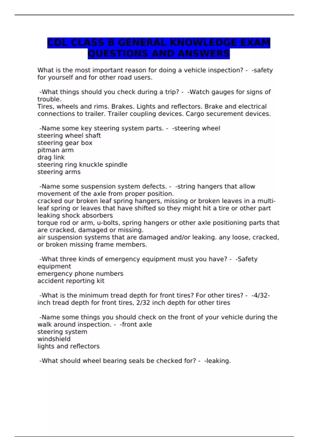 CDL CLASS B GENERAL KNOWLEDGE EXAM QUESTIONS AND ANSWERS