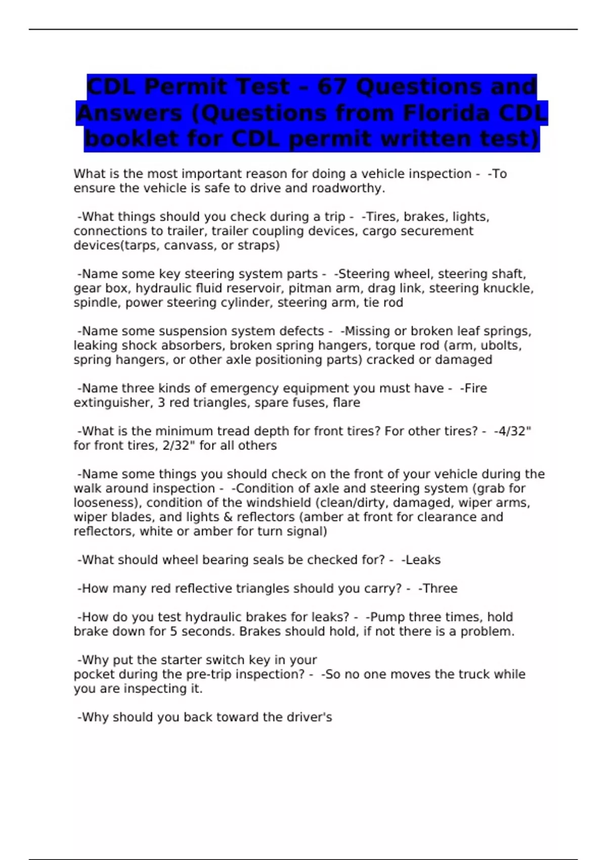 CDL Permit Test – 67 Questions and Answers (Questions from Florida CDL booklet for CDL permit written test)