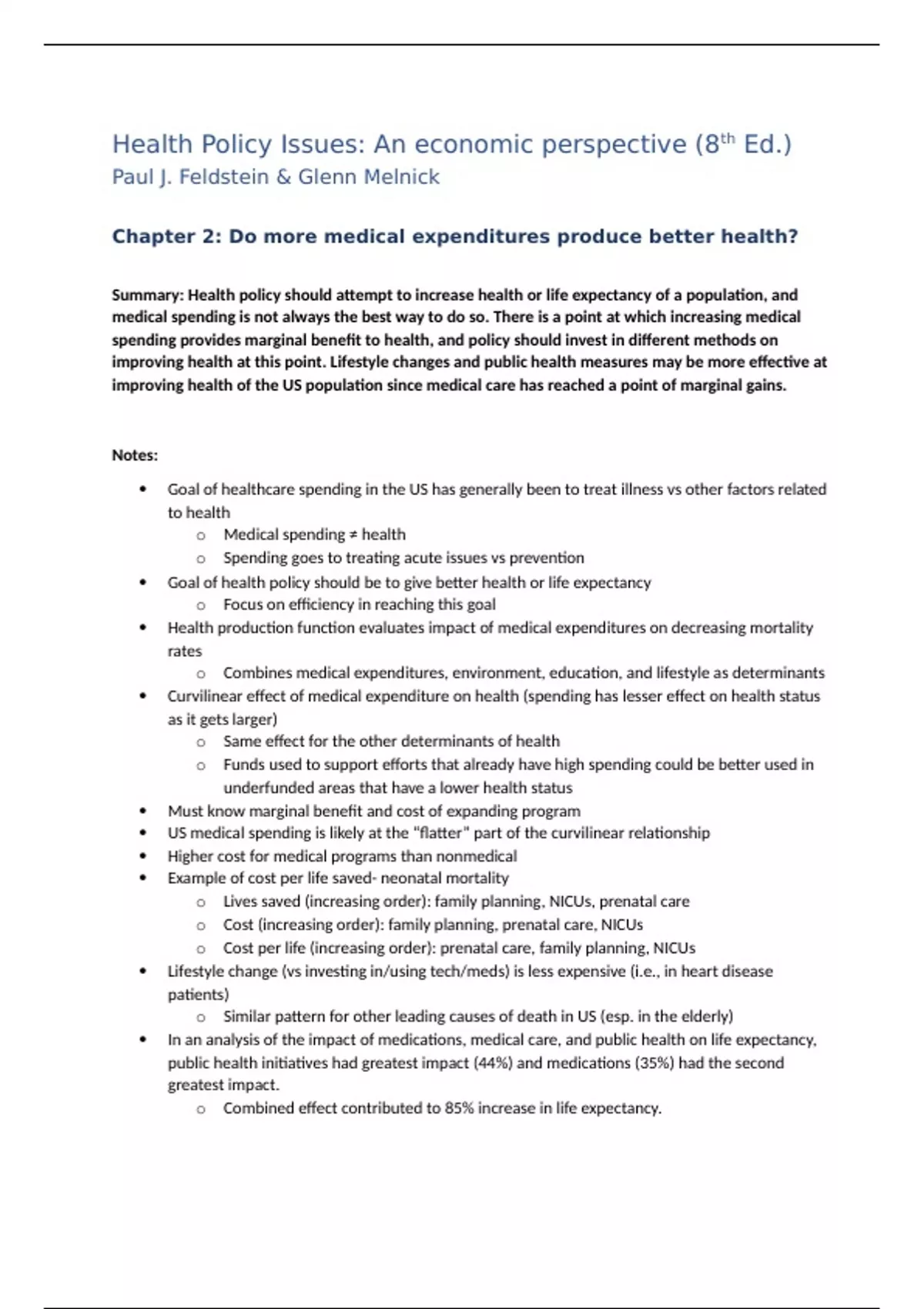This document provides a summary and bullet point notes from chapter 3 of "Health Policy Issues: an Economic Perspective, Eighth Edition" by Paul J. Feinstein.