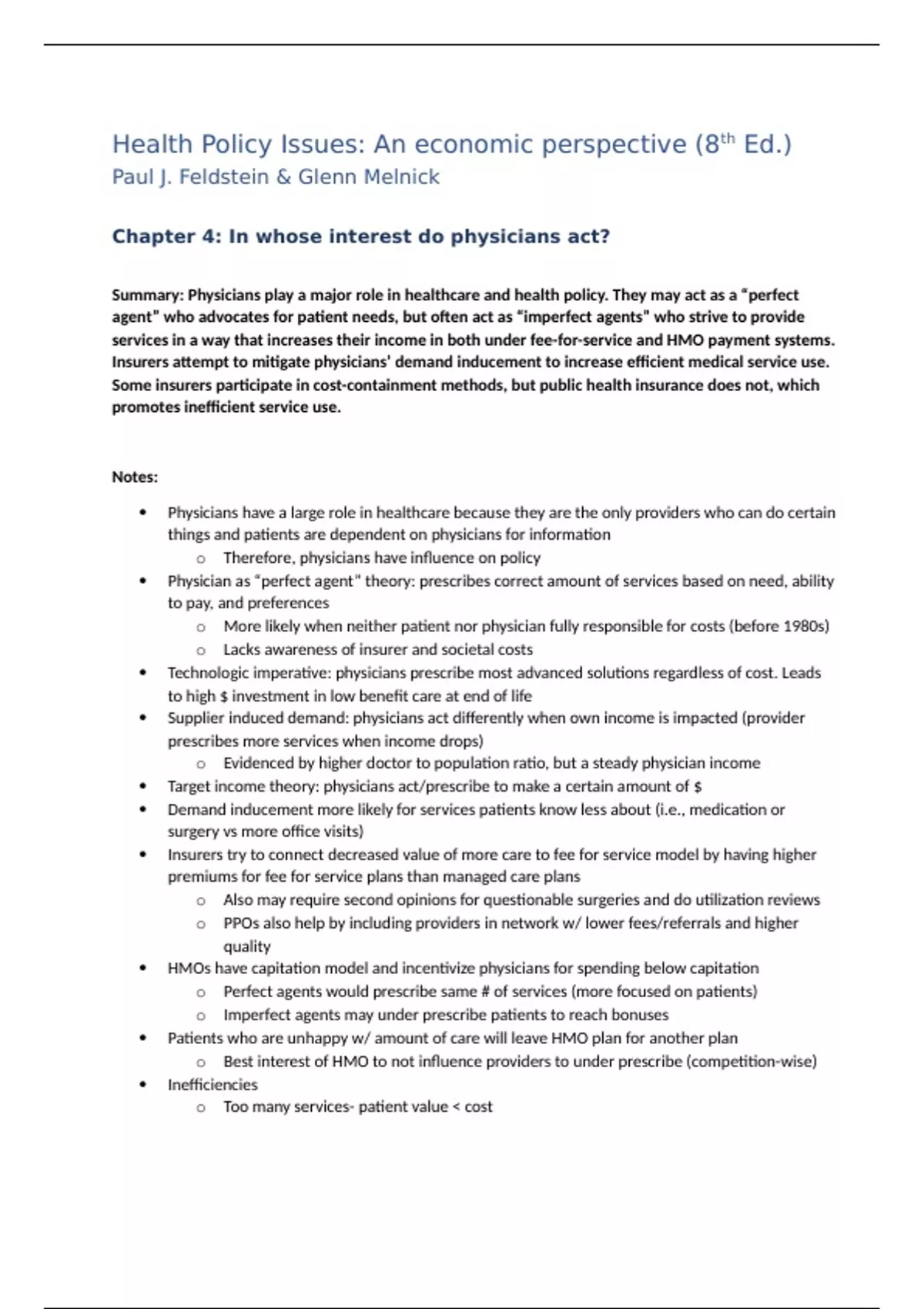 This document provides a summary and bullet point notes from chapter 4 of "Health Policy Issues: an Economic Perspective, Eighth Edition" by Paul J. Feinstein.