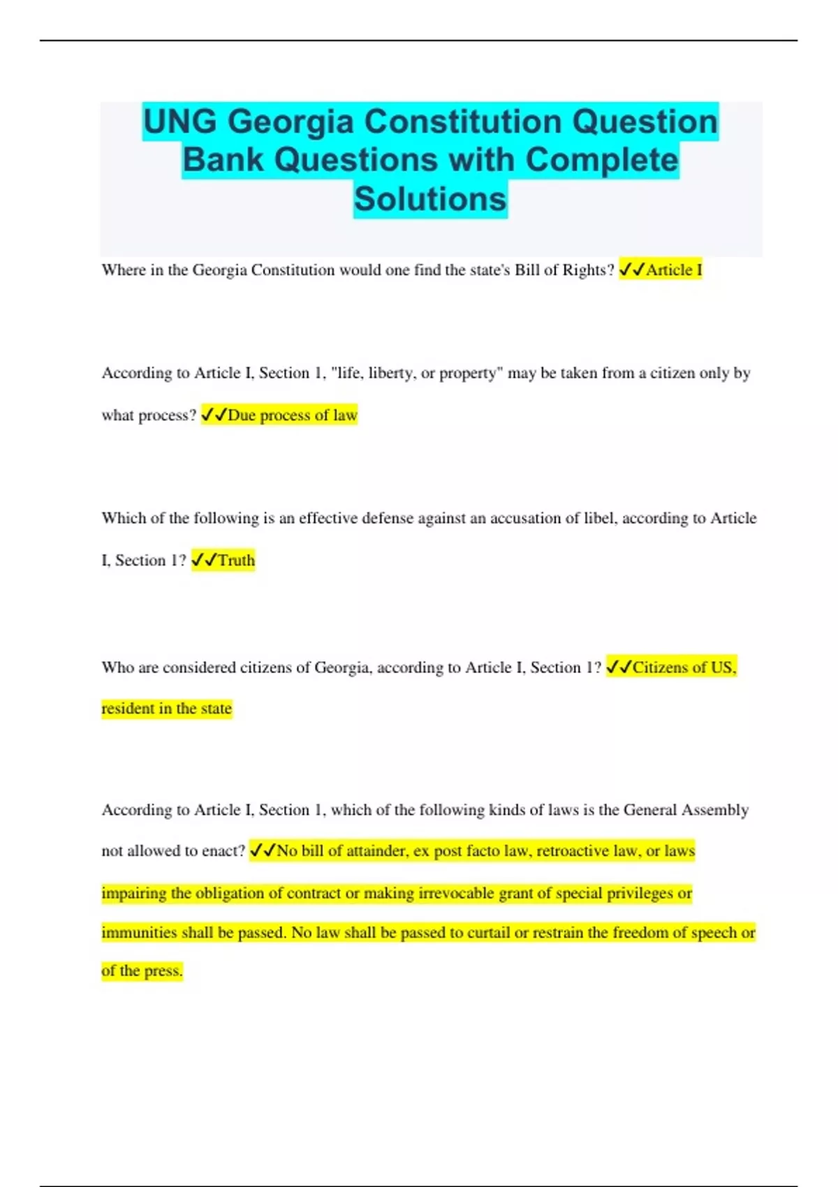 UNG Georgia Constitution Question Bank Questions with Complete Solutions