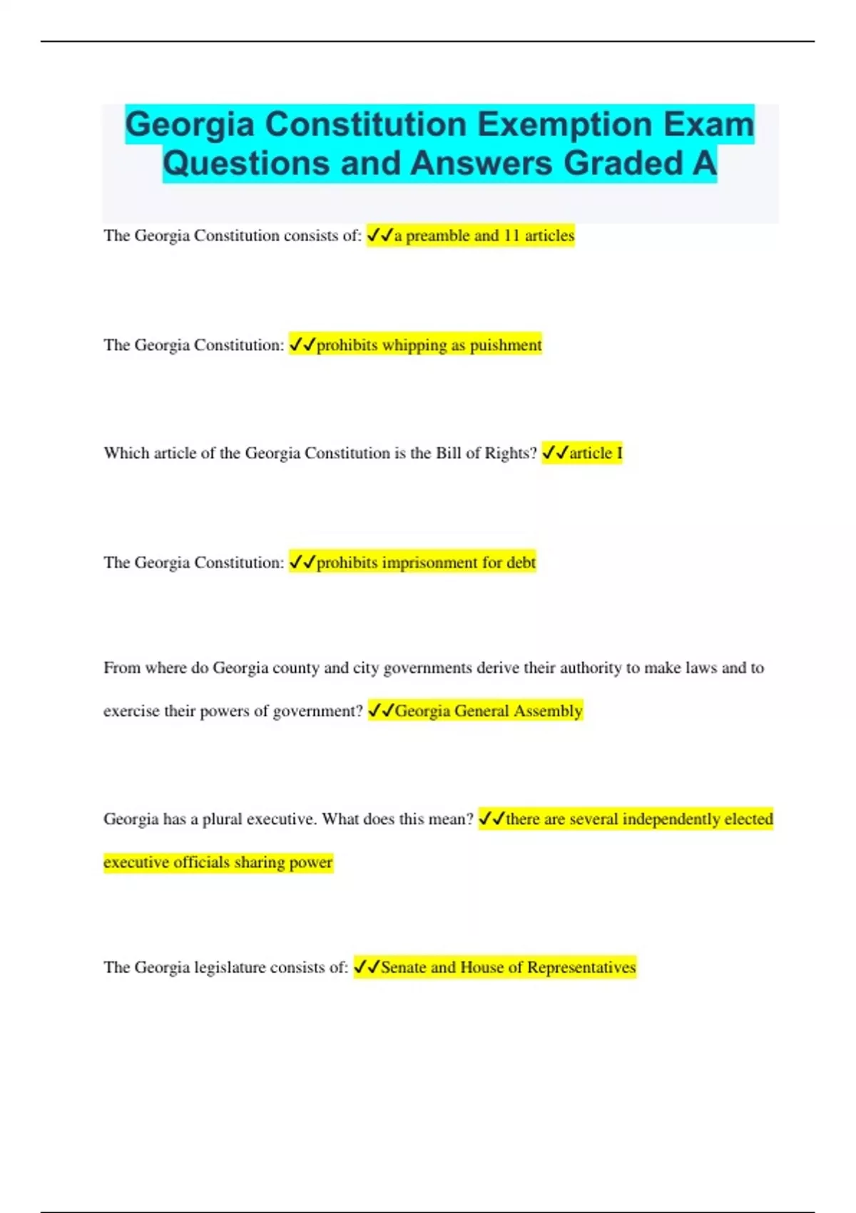 Georgia Constitution Exemption Exam Questions and Answers Graded A