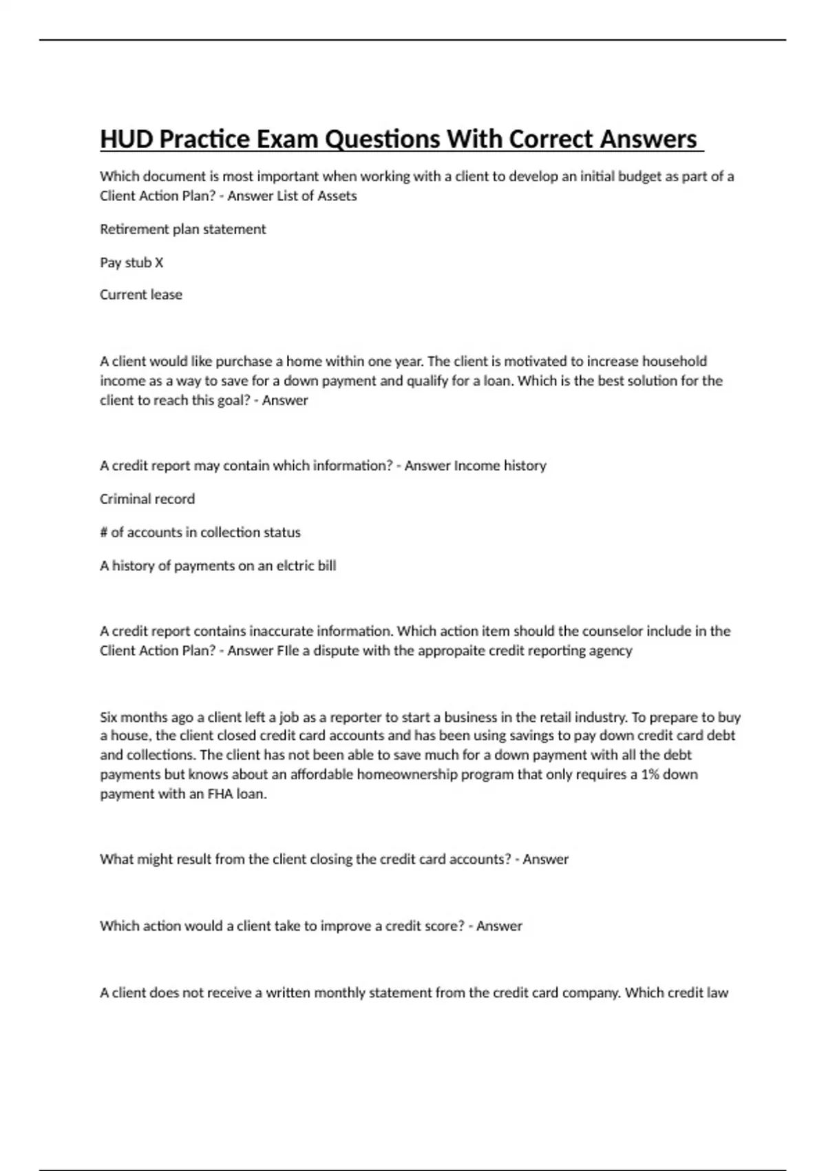 Which document is most important when working with a client to develop an initial budget as part of a Client Action Plan? - Answer List of Assets Retirement plan statement Pay stub X Current lease A client would like purchase a home within one year. The client is motivated to increase household income as a way to save for a down payment and qualify for a loan. Which is the best solution for the client to reach this goal? - Answer A credit report may contain which information? - Answer Income history Criminal record # of accounts in collection status A history of payments on an elctric bill A credit report contains inaccurate information. Which action item should the counselor include in the Client Action Plan? - Answer FIle a dispute with the appropaite credit reporting agency Six months ago a client left a job as a reporter to start a business in the retail industry. To prepare to buy a house, the client closed credit card accounts and has been using savings to pay down credit card debt and collections. The client has not been able to save much for a down payment with all the debt payments but knows about an affordable homeownership program that only requires a 1% down payment with an FHA loan. What might result from the client closing the credit card accounts? - Answer Which action would a client take to improve a credit score? - Answer A client does not receive a written monthly statement from the credit card company. Which credit law could this omission violate? - Answer FCBA A client shopping for a mortgage loan presents a housing counselor with an offer from a local mortgage lender. The interest rate on the offer is 7.5% for a 30-year fixed rate mortgage with a 20% down payment required. The counselor reviews the client file and determines the client's credit score is 725 and the client's total debt-to-income ratio is 20%. The client asks the housing counselor if the offer is a case of illegal predatory lending. How should the housing counselor respond? - Answer I am unable to determine whether the loan is predatory but i suggest you shop around with other ledning sources Which action should a counselor recommend a client take first after discovering identity theft? - Answer File an identity theft report In which situation would a client's responsibilities, recurring costs, and upfront costs be evaluated? - Answer When weighing housing options A client works 40 hours a week making $15 an hour. What is the highest monthly mortgage the client can afford based on income if the client secures a conventional loan? - Answer Front End Ratio Formula Conventional = <28% Which type of government insured loan was created for financing homes in rural areas? - Answer USDA A client keeps having budget problems due to unexpected expenses. Which financial tool would best assist this client to prepare for unexpected expenses and avoid increasing credit usage? - Answer Emergency Fund A client has a monthly household income of $2,300, monthly debt payments of $450, and an optimal monthly housing ratio of 32%. What is the client's optimal monthly housing payment? - Answer Front End Ratio Formula What is the back-end ratio for a client with a monthly housing expense of $1,250, a monthly total of $88 in other consumer debt payments, and a gross household income of $4,460 per month (rounded to the nearest whole percent)? - Answer Debt to income ratio or back end ratio