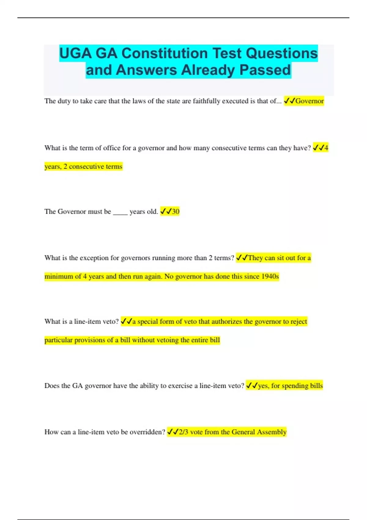 UGA GA Constitution Test Questions and Answers Already Passed The duty to take care that the laws of the state are faithfully executed is that of... Governor What is the term of office for a governor and how many consecutive terms can they have? 4 years, 2 consecutive terms The Governor must be ____ years old. 30 What is the exception for governors running more than 2 terms? They can sit out for a minimum of 4 years and then run again. No governor has done this since 1940s What is a line-item veto? a special form of veto that authorizes the governor to reject particular provisions of a bill without vetoing the entire bill Does the GA governor have the ability to exercise a line-item veto? yes, for spending bills How can a line-item veto be overridden? 2/3 vote from the General Assembly Who has the power of executive clemency in the Georgia Constitution? State Board of Pardons and Paroles Executive Clemency is... the power to grant reprieves, pardons, and paroles. What are the qualifications for members of The US House? 1) at least 25 y/o 2) US citizen >7 years 3) live in the state they represent What are the qualifications for US Senators? 1) at least 30 y/o 2) US citizen >9 years 3) live in the state they represent What are the qualifications for members of The Georgia House? 1) at least 21 y/o 2) US citizen 3) GA citizen for 2 years 4) legal resident of district for 1 year What are the qualifications for members of The Georgia Senate? 1) at least 25 y/o 2) US citizen 3) GA citizen for 2 years 4) legal resident of district for 1 year The terms of Senators and Reps are ____ and have _____ on number of terms 2 years, no limit All bills raising revenue or appropriating money must originate in... The House Votes on bills in the General Assembly must always be by ______ if a bill involves _______. Roll call, appropriations The most important function of the General Assembly