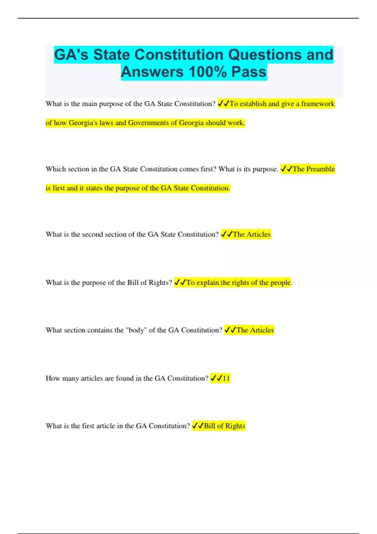GA's State Constitution Questions and Answers 100% Pass What is the main purpose of the GA State Constitution? To establish and give a framework of how Georgia's laws and Governments of Georgia should work. Which section in the GA State Constitution comes first? What is its purpose. The Preamble is first and it states the purpose of the GA State Constitution. What is the second section of the GA State Constitution? The Articles What is the purpose of the Bill of Rights? To explain the rights of the people. What section contains the "body" of the GA Constitution? The Articles How many articles are found in the GA Constitution? 11 What is the first article in the GA Constitution? Bill of Rights How is the GA Constitution different from the U.S. Constitution? Both have a preamble, articles, and amendments. What is the final part of the Constitution? The Amedments. What are the Amendments used to do in the Constitution? Make corrections or additions to the Constitution. How are the U.S. and Ga Constitution different? 1. The U.S. version does not mention education, the GA version does. 2. The U.S. version of the Bill of Rights is at the end (beginning of the Amendments) and the GA version of the Bill of Rights is at the beginning. What is another way to refer to the three branches of government? Checks and Balances. What is it called when the three branches of government can make sure one doesn't gain too much power? Checks and Balances How can the Executive Branch (Governor) check the power of the General Assembly (legislative)? The Governor can VETO and bill before it becomes a law If the Governor vetoes a bill from the General Assembly, what is this called? Checks and Balances What are the separate powers of the Executive, Judicial, and Legislative branches? Executive- Enforces laws. Judicial- Judges(Interprets) laws. Legislative- Makes laws. Which branch can decide if a law is unconstitutional? Judicial Branch An Impeachment of a Governor is an example of what principle? Checks and Balances How can Congress or the General Assembly check the power of the Executive Branch? By voting to override a veto What are three examples of Responsibilities? Paying taxes, Serving on juries, Volunteering, and Voting What are three examples of a person's Rights? Freedom of Speech, Freedom of the Press, and Freedom of Religion How can someone check for updates on public policies quickly? The internet If someone has an issue they are concerned about, what is one way to get you voice heard? Vote, contact your representatives, or protest What do voting, helping the homeless, etc. have in common? Civic Responsibility Why is voting such an important of our government? The process elects people into positions of power who vote on the laws of the land. What is the best definition of "civic responsibility?" The responsibility of the citizen to assist and contribute to their community. What are the four qualifications to vote in GA? Must be a U.S. Citizen Must be 18 by election day Must be registered to vote Must be a legal resident of Georgia and the county where a person wants to vote Can one vote if they are not a citizen? NO If a person that is 18 wants to vote, where do they go to register to vote? Nowadays, many places. Library, Department of Motor Vehicles, the County Registers Office, often the County's Registers Office will come to the local high schools and help high school seniors register to vote. What are two reasons a person cannot vote? Cannot currently be serving time in jail for a felony offense, or voters cannot be ruled mentally incompetent How can a person place their vote if they are going to be out of town the day of the election? Absentee Ballot What are the three main purposes of the GA pledge of allegiance? Wisdom- applies to the Legislative branch and its making of state laws. Justice- applies to the just and fair decisions made by the Judicial branch. Moderation- applies to the use of moderation in administering laws by the Executive branch.