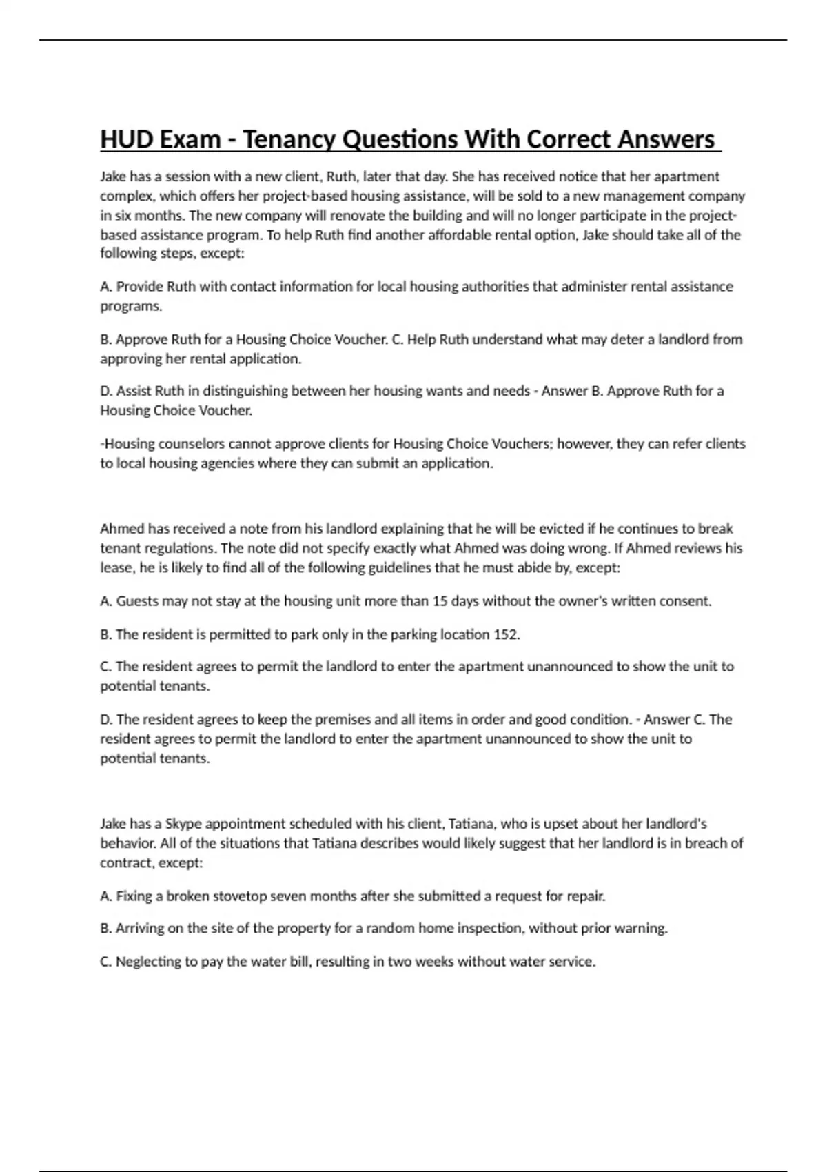 HUD Exam - Tenancy Questions With Correct Answers