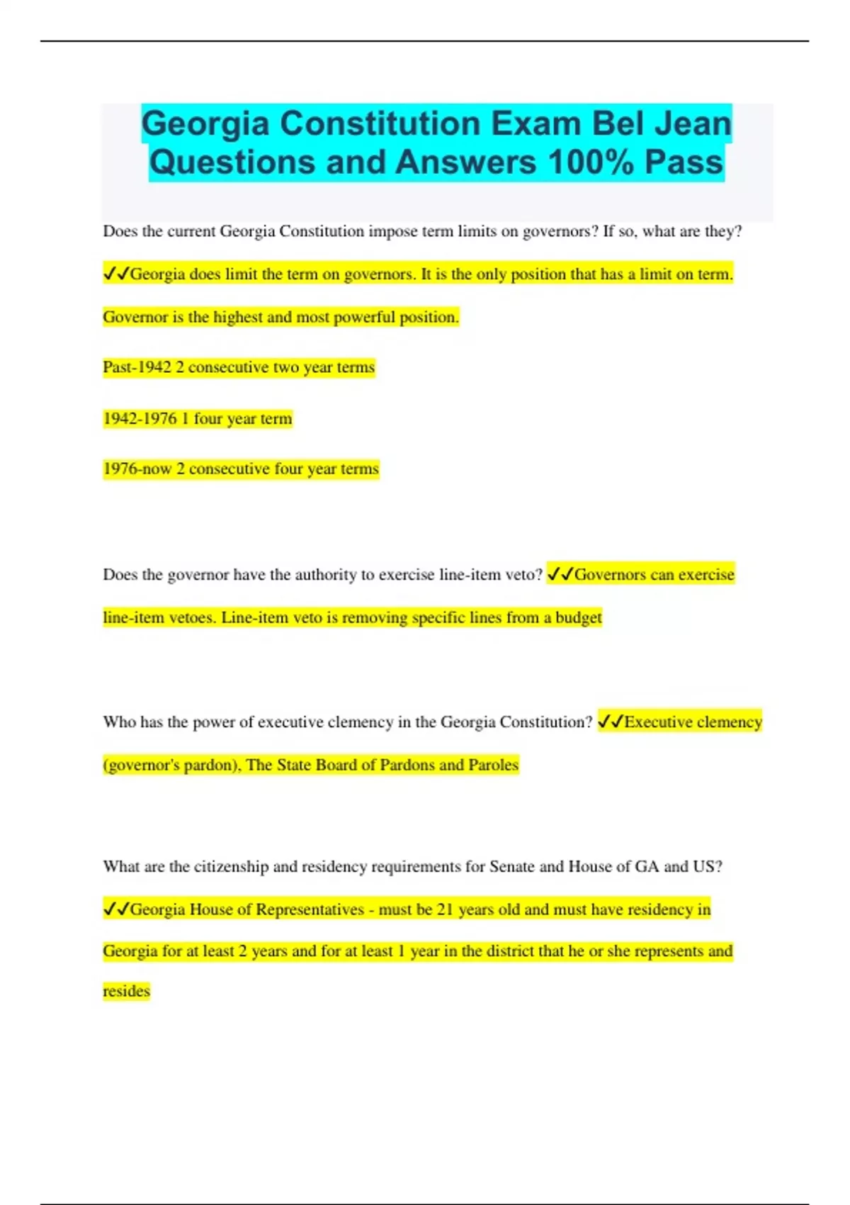 Georgia Constitution Exam Bel Jean Questions and Answers 100% Pass Does the current Georgia Constitution impose term limits on governors? If so, what are they? Georgia does limit the term on governors. It is the only position that has a limit on term. Governor is the highest and most powerful position. Past-1942 2 consecutive two year terms four year term 1976-now 2 consecutive four year terms Does the governor have the authority to exercise line-item veto? Governors can exercise line-item vetoes. Line-item veto is removing specific lines from a budget Who has the power of executive clemency in the Georgia Constitution? Executive clemency (governor's pardon), The State Board of Pardons and Paroles What are the citizenship and residency requirements for Senate and House of GA and US? Georgia House of Representatives - must be 21 years old and must have residency in Georgia for at least 2 years and for at least 1 year in the district that he or she represents and resides US House - must be 25 years old, a citizen of the US for at least 7 years prior to the election, a resident of the state that he or she has chosen to represent Georgia Senate - must be 25 years old and must have residency in Georgia for at least 2 years and for at least 1 year in the district that he or she represents US Senate - must be 30 years old, a citizen of the US for at least 9 years prior to election , a resident of the state represented What are the responsibilities of the lieutenant governor in Georgia? Lieutenant governor aka president of the senate oversees committee on senate membership. They do not run with governor, elected separately. Besides the governor and lieutenant governor, who else are elected executive officers? * Attorney general: represents the state in legal matters Secretary of state: runs elections, handles incorporation of businesses, and maintains GA archives. Insurance commissioner: set rates and determine which carriers will be licensed to operate in GA. Also serves as state fire marshal. State school superintendent: Commissioner of agriculture: provides information to farmers and certifies the accuracy and quality of fertilizer Commissioner of labor: occupational safety and the administration of labor laws, addresses unemployment. Public service commission: regulates industries and their rates such as telephones, electricity, and natural gas, trucks, buses What are the qualifications and responsibilities of an attorney general? Attorney general represents the state in legal matters. They must be at least 25 years, citizen for 10 years, live in GA for 4 years. List the Georgia constitutional boards and commissions? Public Service Commission - five members to be elected by the people, oversees utilities like gas, electricity, communication networks and transportation State Board of Pardons and Paroles - five members appointed by the Governor, power of executive clemency, including the powers to grant reprieves, pardons and paroles State Transportation Board - as many members as congressional districts in the state to be elected by a majority vote of the members of the House of Representatives and Senate, in charge of transportation, highway construction, railroads Veterans Service Board - seven members appointed by the Governor Board of Natural Resources - one member from each congressional district in the state and five members from the state at large all appointed by the Governor Educational Board - governor, one member per district Regents - one per district, appointed by governor, in charge of colleges How many days does the Georgia General Assembly meet each year "in session"? What is a "special session"? The Georgia General Assembly's most important function is to pass the state's operating budget. They meet "in session" 40 days a year but not necessarily consecutive. Special session happens with three-fifths agreement of the membership of each chamber. What is the term length for Georgia state legislators? State legislators are elected by their district for a 2 year term. How many members make up the Georgia General Assembly? The Georgia General assembly is comprised of 236 members The passage of legislation by the General Assembly requires what proportion of support from each chamber? The passage of legislation requires a two-thirds vote from both houses What are the powers of the Board of Regents of the University system of Georgia? The Board of Regents exercises the exclusive right to govern, control, and manage the University System of Georgia, an educational system comprised of thirty-five institutions. Creates new public colleges, junior colleges, and universities What does the constitution indicate about the state's legal commitment to public education? Free public education prior to college What proportion of the vote is required to be elected to public office in Georgia? Candidate must capture 50% of the vote. If not, a runoff is held What requirements does Georgia have for those who wish to vote in an election? Must be a US citizen, a citizen of GA, 18 by election day, cannot be a felon What is eminent domain? Taking private property for public use How many counties are there in Georgia? 159 What is home rule? Counties/cities have the ability to have some government and legal powers of their own as long as they are not allowing things outside of the constitution (aka local self-government) What are the categories of expenditures for which lottery proceeds can be used? Educational programs and purposes and the governor's annual budget What does it mean to have an open direct primary?* All voters can take part. In primary elections the political party nominates candidates for the next general election. What is the jurisdiction of the "State Court" in Georgia's court system? misdemeanor violations-traffic cases, and all civil actions, regardless of the amount claimed, unless the superior court has exclusive jurisdiction: hearings on applications for an issuance of search and a