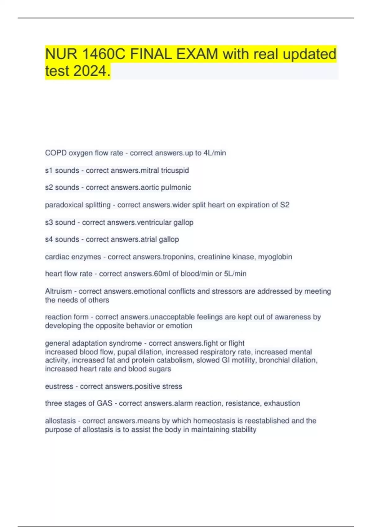 NUR 1460C FINAL EXAM with real updated test 2024. COPD oxygen flow rate - correct to 4L/min s1 sounds - correct l tricuspid s2 sounds - correct c pulmonic paradoxical splitting - correct split heart on expiration of S2 s3 sound - correct icular gallop s4 sounds - correct l gallop cardiac enzymes - correct nins, creatinine kinase, myoglobin heart flow rate - correct answers.60ml of blood/min or 5L/min Altruism - correct onal conflicts and stressors are addressed by meeting the needs of others reaction form - correct eptable feelings are kept out of awareness by developing the opposite behavior or emotion general adaptation syndrome - correct or flight increased blood flow, pupal dilation, increased respiratory rate, increased mental activity, increased fat and protein catabolism, slowed GI motility, bronchial dilation, increased heart rate and blood sugars eustress - correct ive stress three stages of GAS - correct reaction, resistance, exhaustion allostasis - correct by which homeostasis is reestablished and the purpose of allostasis is to assist the body in maintaining stability