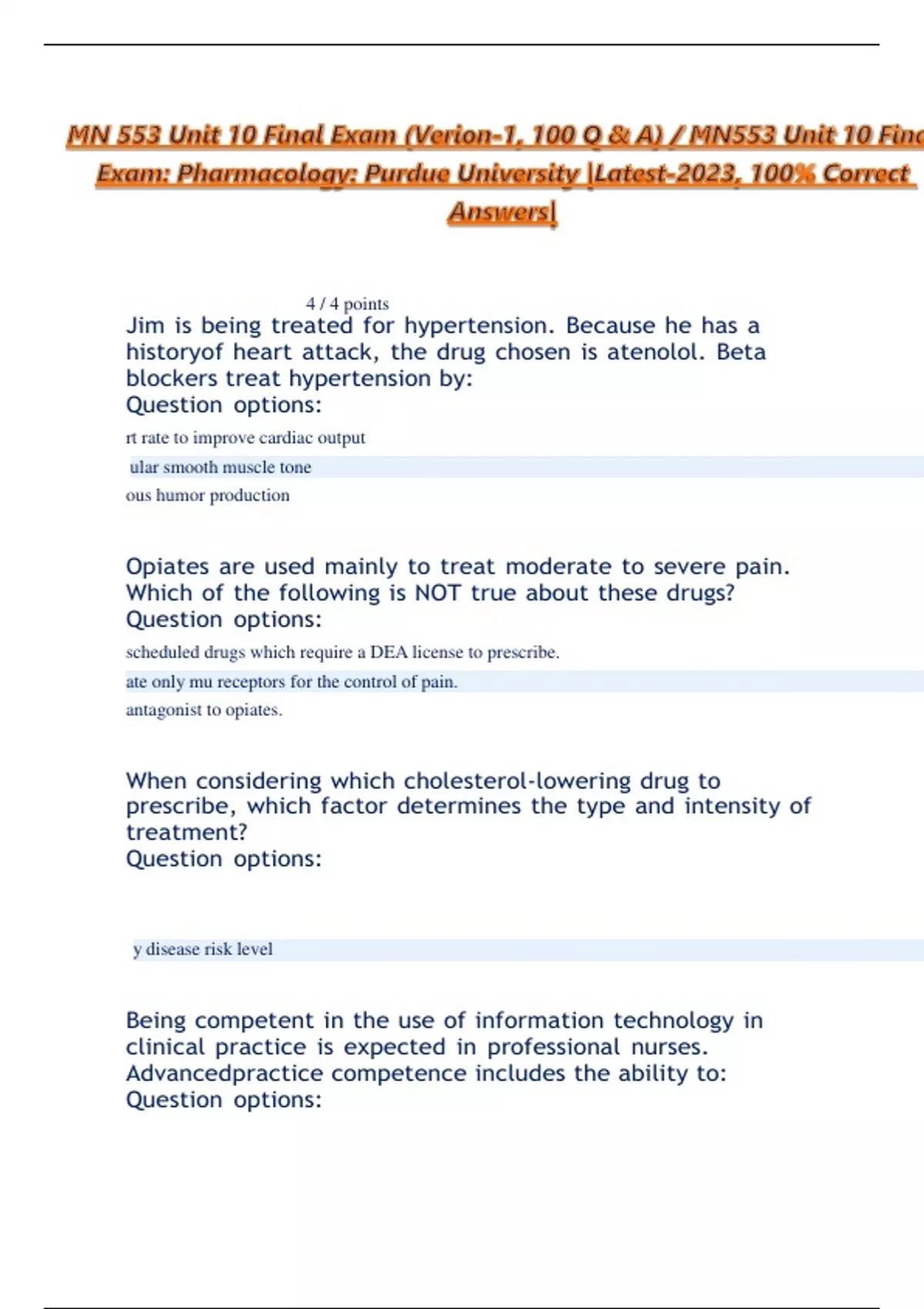 MN 553 Unit 10 Final Exam (Verion-1, 100 Q & A) / MN553 Unit 10 Final Exam: Pharmacology: Purdue University |Latest-2024, 100% Correct Answers|