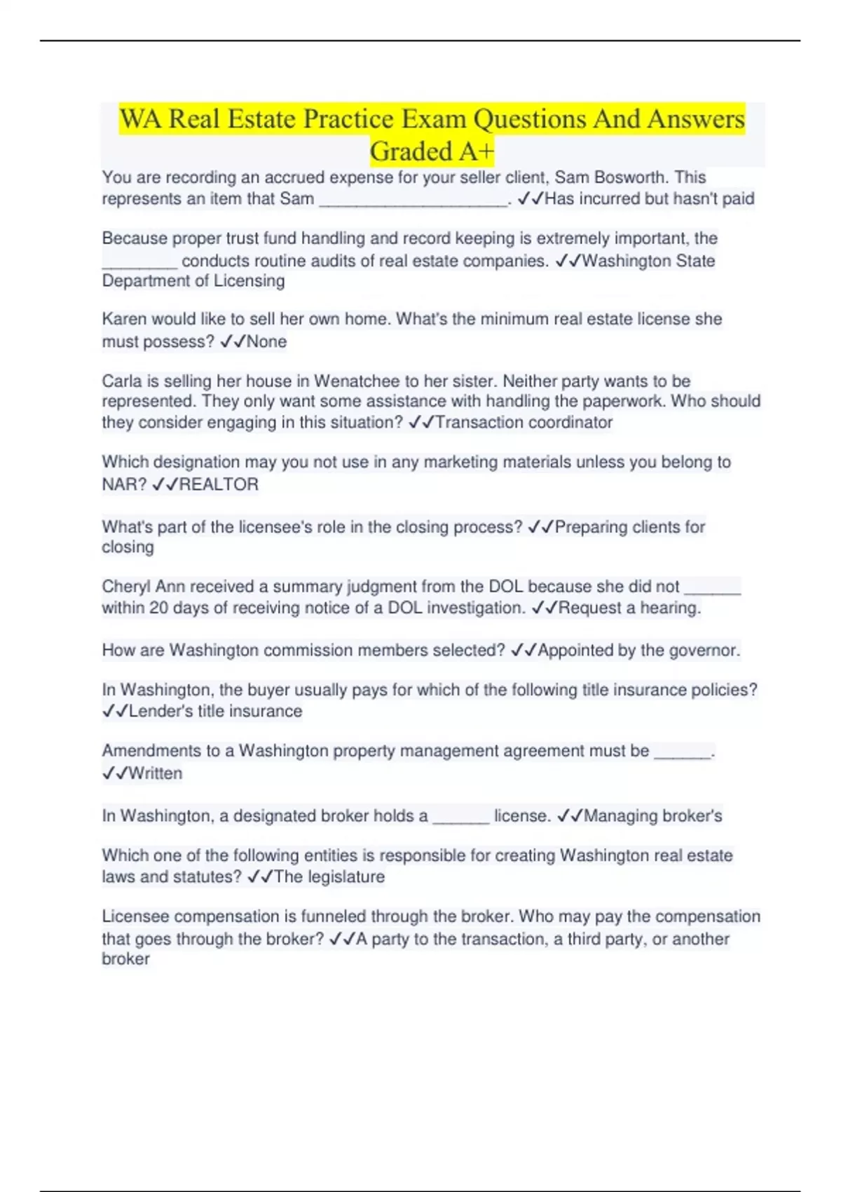 WA Real Estate Practice Exam Questions And Answers Graded A+