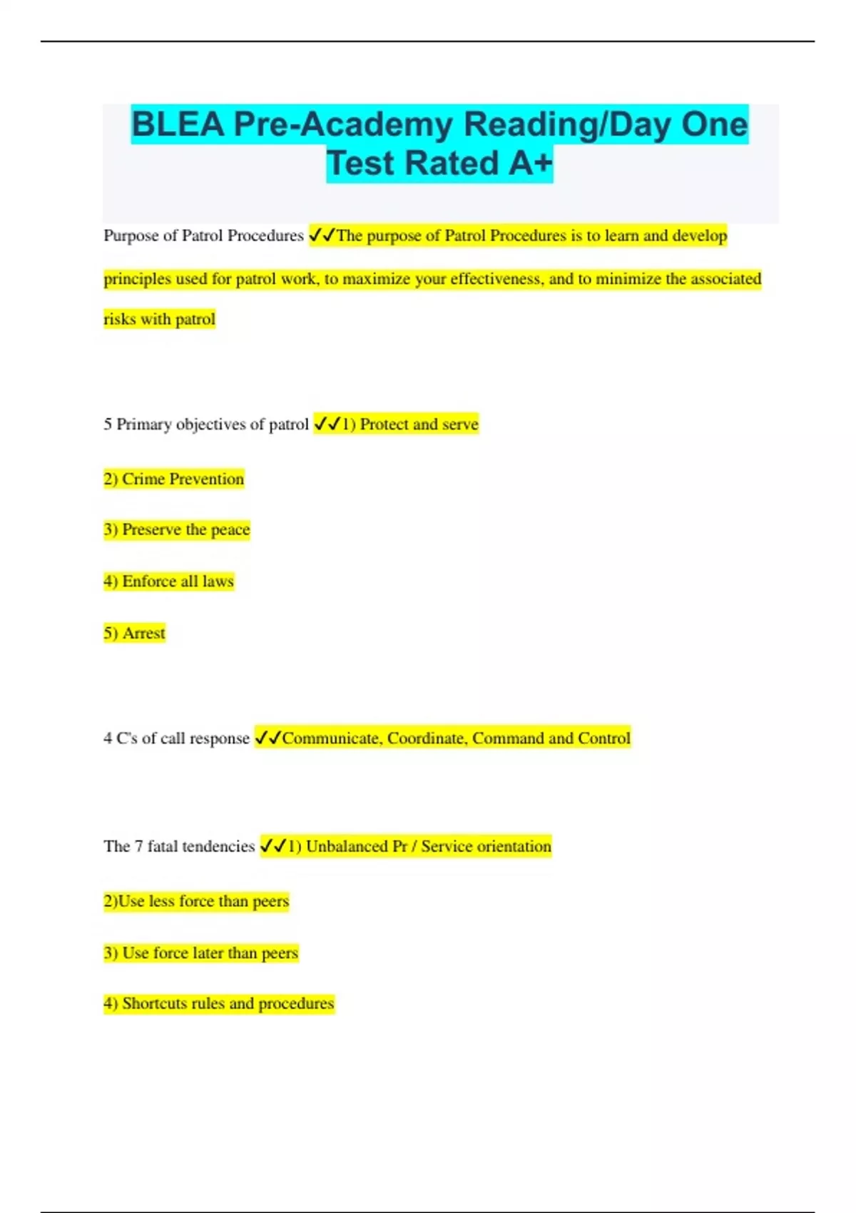 BLEA Pre-Academy Reading/Day One Test Rated A+ Purpose of Patrol Procedures The purpose of Patrol Procedures is to learn and develop principles used for patrol work, to maximize your effectiveness, and to minimize the associated risks with patrol 5 Primary objectives of patrol 1) Protect and serve 2) Crime Prevention 3) Preserve the peace 4) Enforce all laws 5) Arrest 4 C's of call response Communicate, Coordinate, Command and Control The 7 fatal tendencies 1) Unbalanced Pr / Service orientation 2)Use less force than peers 3) Use force later than peers 4) Shortcuts rules and procedures 5) Acts without backup 6) Relies too heavily on "reading" people 7) Drops guard when good is perceived Ten deadly errors 1) Failure to watch hands 2) Apathy towards suspect 3) lack of rest 4) Tombstone courage (Acting alone) 5) Preoccupation 6) Missing danger signs 7) Taking a bad position 8) Relaxing too soon 9) Improper search or handcuffing 10) Failure to maintain proficiency with equipment What is Criminal Procedure? Criminal Procedure is the way in which peace officers lawfully do their job to ensure successful prosecution of offenders. Substantive Law Legislated acts Establishes the acts and mental state necessary to commit a crime Procedural Law Legislated acts Establishes the procedures to be employed in governmental affairs Significance of Criminal procedur
