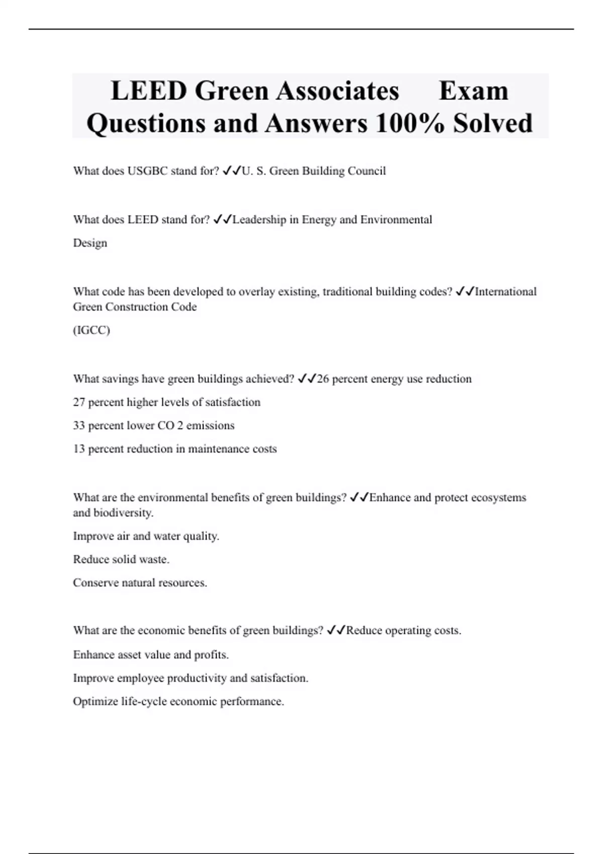 LEED Green Associates Exam Questions and Answers 100% Solved What does USGBC stand for? U. S. Green Building Council What does LEED stand for? Leadership in Energy and Environmental Design What code has been developed to overlay existing, traditional building codes? International Green Construction Code (IGCC) What savings have green buildings achieved? 26 percent energy use reduction 27 percent higher levels of satisfaction 33 percent lower CO 2 emissions 13 percent reduction in maintenance costs What are the environmental benefits of green buildings? Enhance and protect ecosystems and biodiversity. Improve air and water quality. Reduce solid waste. Conserve natural resources. What are the economic benefits of green buildings? Reduce operating costs. Enhance asset value and profits. Improve employee productivity and satisfaction. Optimize life‐cycle economic performance.