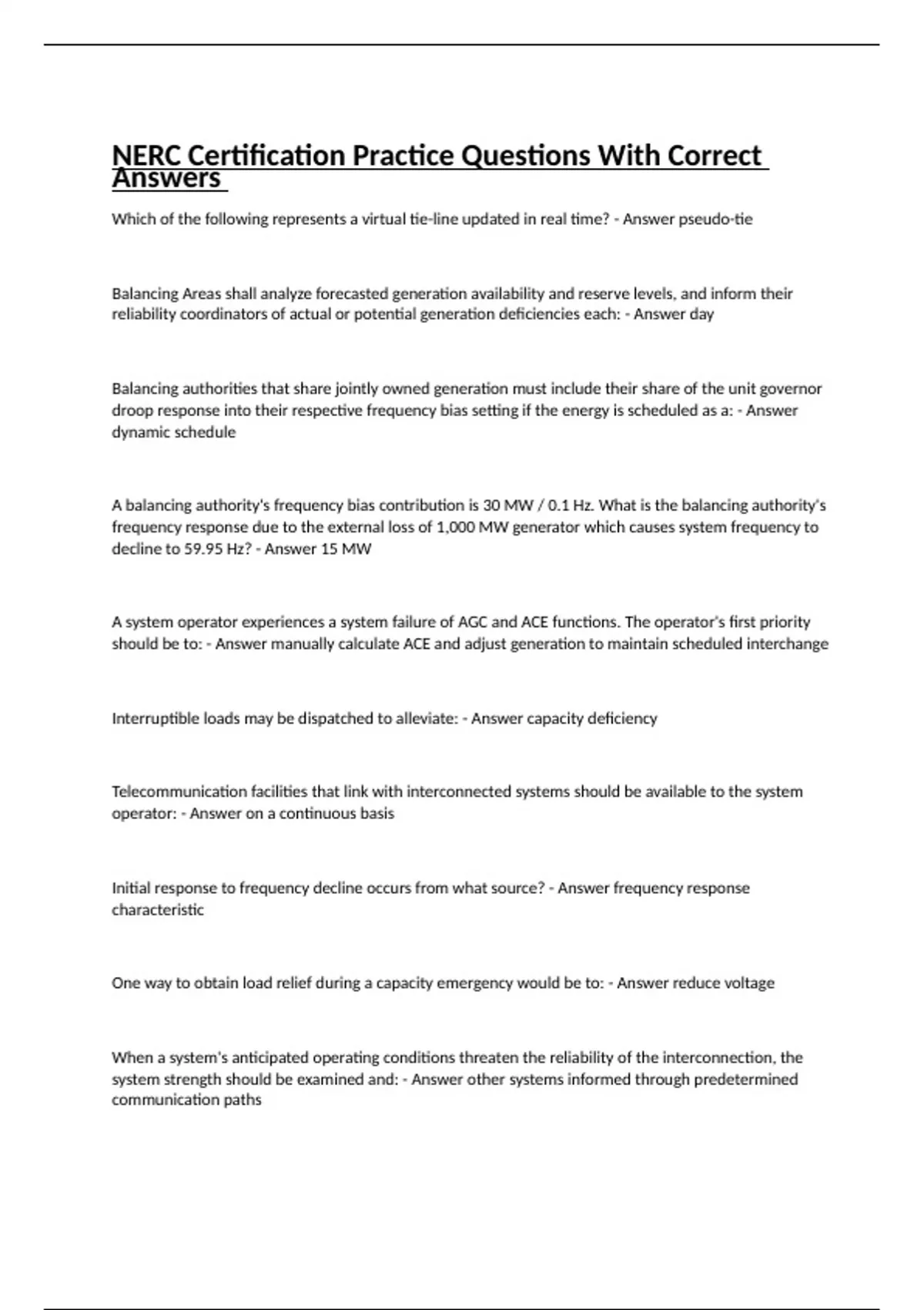NERC Certification Practice Questions With Correct Answers