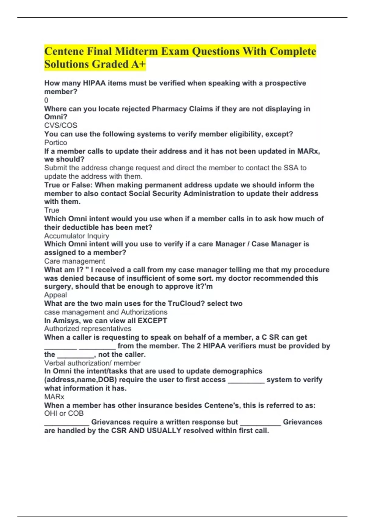Centene Final Midterm Exam Questions With Complete Solutions Graded A+ How many HIPAA items must be verified when speaking with a prospective member? 0 Where can you locate rejected Pharmacy Claims if they are not displaying in Omni? CVS/COS You can use the following systems to verify member eligibility, except? Portico If a member calls to update their address and it has not been updated in MARx, we should? Submit the address change request and direct the member to contact the SSA to update the address with them. True or False: When making permanent address update we should inform the member to also contact Social Security Administration to update their address with them. True Which Omni intent would you use when if a member calls in to ask how much of their deductible has been met? Accumulator Inquiry Which Omni intent will you use to verify if a care Manager / Case Manager is assigned to a member? Care management What am I? '' I received a call from my case manager telling me that my procedure was denied because of insufficient of some sort. my doctor recommended this surgery, should that be enough to approve it?'m Appeal What are the two main uses for the TruCloud? select two case management and Authorizations In Amisys, we can view all EXCEPT Authorized representatives When a caller is requesting to speak on behalf of a member, a C SR can get ________ _________ from the member. The 2 HIPAA verifiers must be provided by the _________, not the caller. Verbal authorization/ member In Omni the intent/tasks that are used to update demographics (address,name,DOB) require the user to first access _________ system to verify what information it has. MARx When a member has other insurance besides Centene's, this is referred to as: OHI or COB ___________ Grievances require a written response but __________ Grievances are handled by the CSR AND USUALLY resolved within first call.
