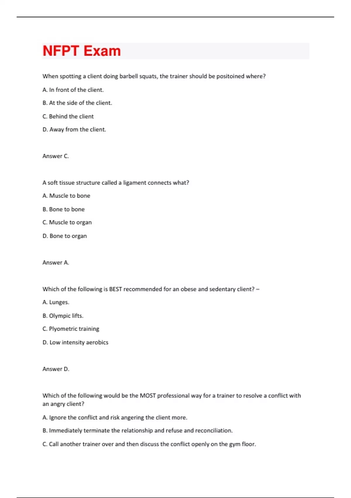 When spotting a client doing barbell squats, the trainer should be positoined where? A. In front of the client. B. At the side of the client. C. Behind the client D. Away from the client. Answer C. A soft tissue structure called a ligament connects what? A. Muscle to bone B. Bone to bone C. Muscle to organ D. Bone to organ Answer A. Which of the following is BEST recommended for an obese and sedentary client? – A. Lunges. B. Olympic lifts. C. Plyometric training D. Low intensity aerobics Answer D. Which of the following would be the MOST professional way for a trainer to resolve a conflict with an angry client? A. Ignore the conflict and risk angering the client more. B. Immediately terminate the relationship and refuse and reconciliation. C. Call another trainer over and then discuss the conflict openly on the gym floor.D. Listen to the client's complaint in private and discuss resolution options. Answer D. The Basal Metabolic Rate (BMR) provides the certified personal trainer (CPT) the basis to determine the what? A. Proper caloric intake for meeting the client's goal. B. Client's body mass. C. Adequate repetition range for the client's weight loss. Client's healthy heart rate. Answer A.