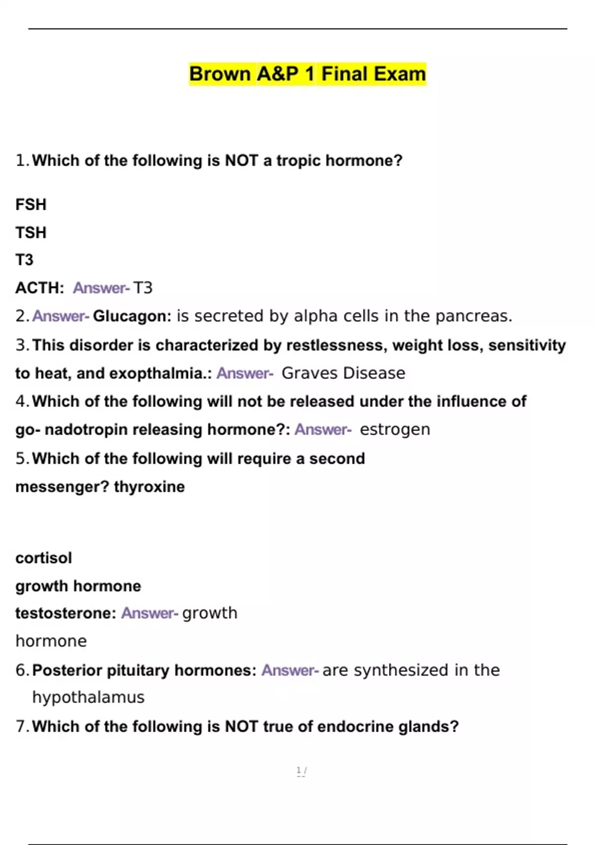 brown ap 1 final exam actual questions and answer