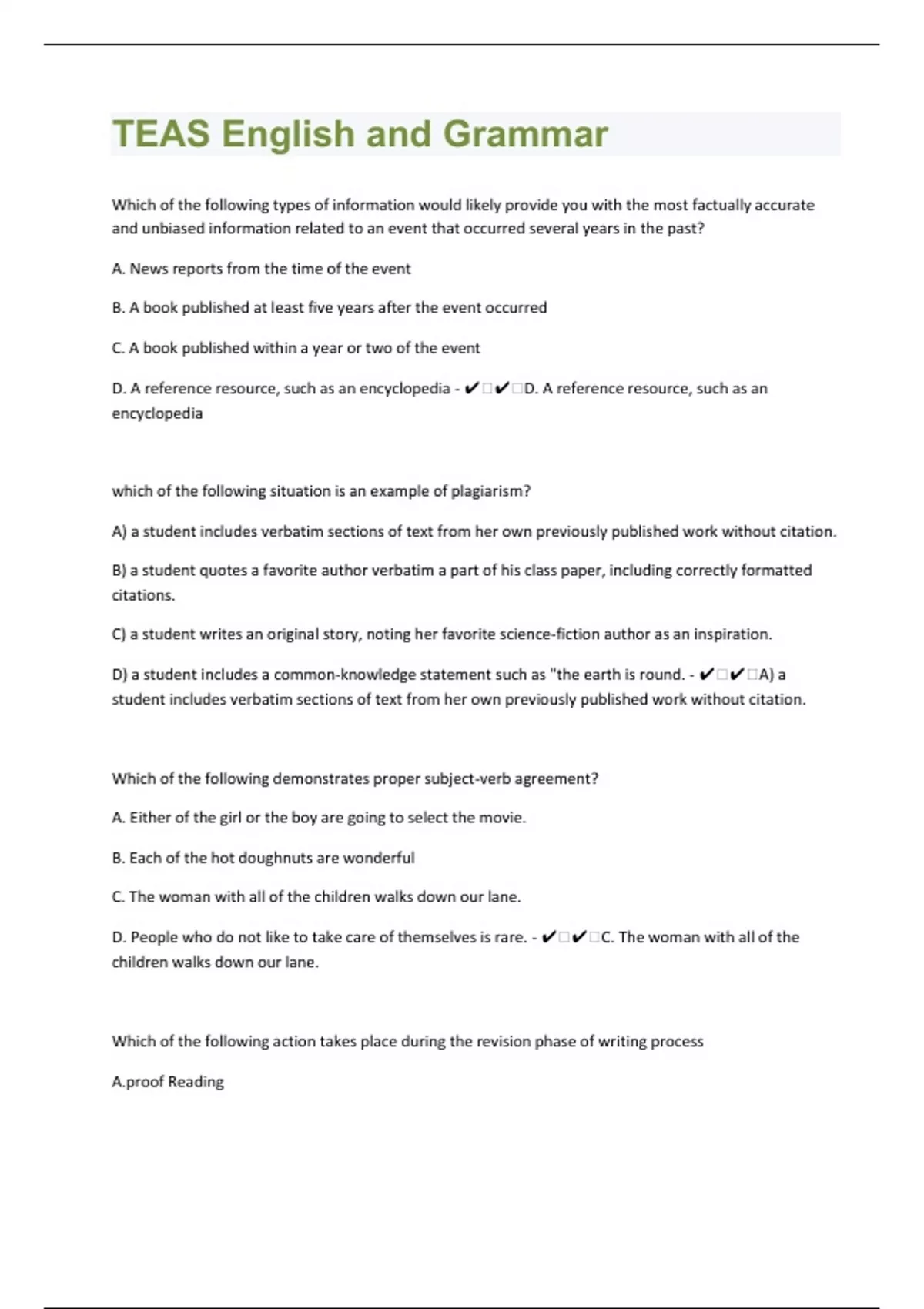 Which of the following types of information would likely provide you with the most factually accurate and unbiased information related to an event that occurred several years in the past? A. News reports from the time of the event B. A book published at least five years after the event occurred C. A book published within a year or two of the event D. A reference resource, such as an encyclopedia - ️️D. A reference resource, such as an encyclopedia which of the following situation is an example of plagiarism? A) a student includes verbatim sections of text from her own previously published work without citation. B) a student quotes a favorite author verbatim a part of his class paper, including correctly formatted citations. C) a student writes an original story, noting her favorite science-fiction author as an inspiration. D) a student includes a common-knowledge statement such as "the earth is round. - ️️A) a student includes verbatim sections of text from her own previously published work without citation. Which of the following demonstrates proper subject-verb agreement? A. Either of the girl or the boy are going to select the movie. B. Each of the hot doughnuts are wonderful C. The woman with all of the children walks down our lane. D. People who do not like to take care of themselves is rare. - ️️C. The woman with all of the children walks down our lane.