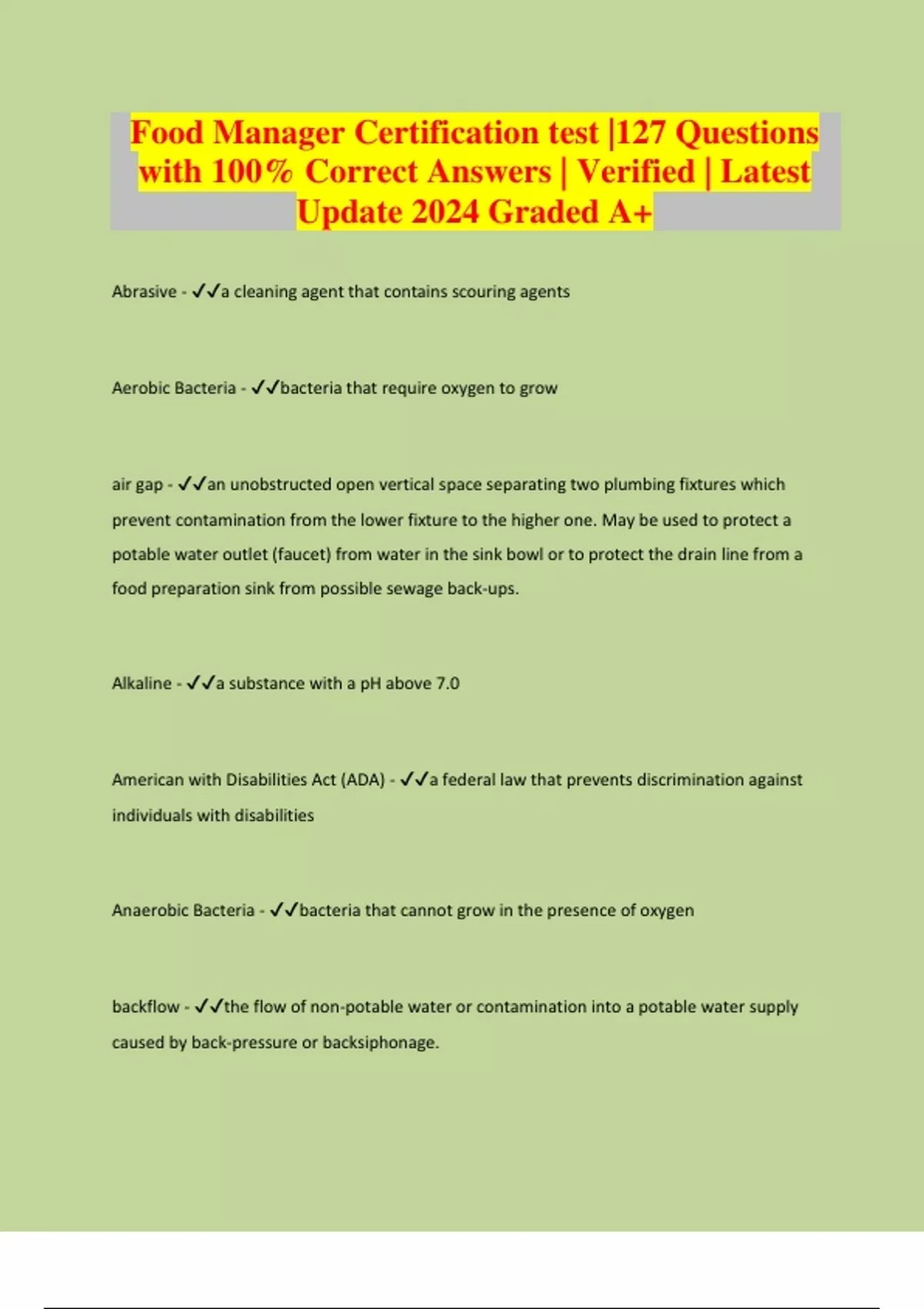 Food Manager Certification test |127 Questions with 100% Correct Answers | Verified | Latest Update 2024 Graded A+
