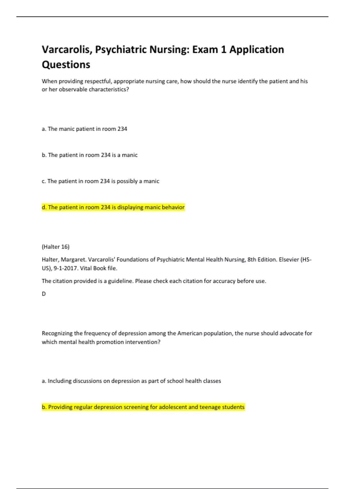 When providing respectful, appropriate nursing care, how should the nurse identify the patient and his or her observable characteristics? a. The manic patient in room 234 b. The patient in room 234 is a manic c. The patient in room 234 is possibly a manic d. The patient in room 234 is displaying manic behavior (Halter 16) Halter, Margaret. Varcarolis' Foundations of Psychiatric Mental Health Nursing, 8th Edition. Elsevier (HSUS), 9-1-2017. Vital Book file. The citation provided is a guideline. Please check each citation for accuracy before use. D Recognizing the frequency of depression among the American population, the nurse should advocate for which mental health promotion intervention? a. Including discussions on depression as part of school health classes b. Providing regular depression screening for adolescent and teenage students