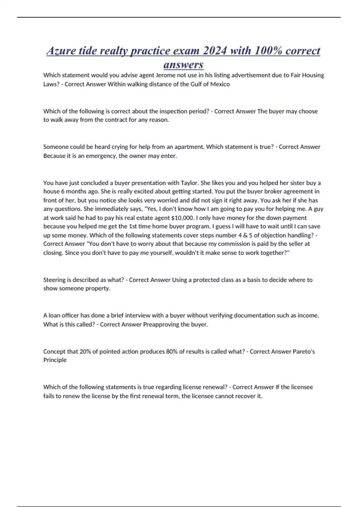 Azure tide realty practice exam 2024 with 100% correct answers Which statement would you advise agent Jerome not use in his listing advertisement due to Fair Housing Laws? - Correct Answer Within walking distance of the Gulf of Mexico Which of the following is correct about the inspection period? - Correct Answer The buyer may choose to walk away from the contract for any reason. Someone could be heard crying for help from an apartment. Which statement is true? - Correct Answer Because it is an emergency, the owner may enter. You have just concluded a buyer presentation with Taylor. She likes you and you helped her sister buy a house 6 months ago. She is really excited about getting started. You put the buyer broker agreement in front of her, but you notice she looks very worried and did not sign it right away. You ask her if she has any questions. She immediately says, "Yes, I don't know how I am going to pay you for helping me. A guy at work said he had to pay his real estate agent $10,000. I only have money for the down payment because you helped me get the 1st time home buyer program. I guess I will have to wait until I can save up some money. Which of the following statements cover steps number 4 & 5 of objection handling? - Correct Answer "You don't have to worry about that because my commission is paid by the seller at closing. Since you don't have to pay me yourself, wouldn't it make sense to work together?" Steering is described as what? - Correct Answer Using a protected class as a basis to decide where to show someone property. A loan officer has done a brief interview with a buyer without verifying documentation such as income. What is this called? - Correct Answer Preapproving the buyer. Concept that 20% of pointed action produces 80% of results is called what? - Correct Answer Pareto's Principle Which of the following statements is true regarding license renewal? - Correct Answer If the licensee fails to renew the license by the first renewal term, the licensee cannot recover it