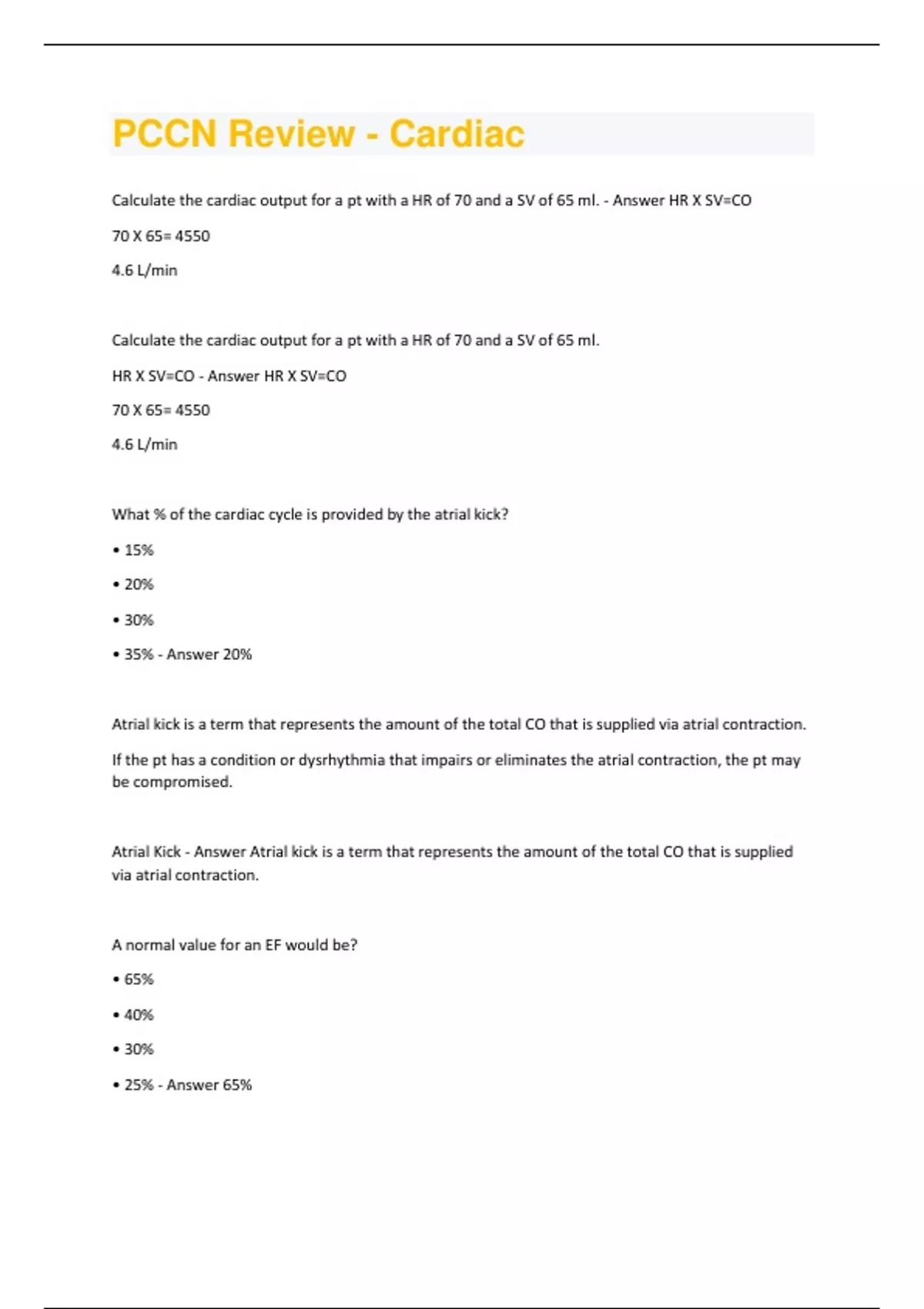 Calculate the cardiac output for a pt with a HR of 70 and a SV of 65 ml. - Answer HR X SV=CO 70 X 65= 4550 4.6 L/min Calculate the cardiac output for a pt with a HR of 70 and a SV of 65 ml. HR X SV=CO - Answer HR X SV=CO 70 X 65= 4550 4.6 L/min What % of the cardiac cycle is provided by the atrial kick? • 15% • 20% • 30% • 35% - Answer 20% Atrial kick is a term that represents the amount of the total CO that is supplied via atrial contraction. If the pt has a condition or dysrhythmia that impairs or eliminates the atrial contraction, the pt may be compromised. Atrial Kick - Answer Atrial kick is a term that represents the amount of the total CO that is supplied via atrial contraction. A normal value for an EF would be? • 65% • 40% • 30% • 25% - Answer 65%The EF should be more than 50%. It represents the amount of blood ejected from the left ventricle compared to the total amount available, expressed as a %. An EF of 35% or less indicates a problem with contractility, outflow or filling. EXA: If the ventricle contains 90ml of blood and 50mls are ejected, the amount would be expressed as a %, in this case 55%. A 67 year old male is admitted with chest pain after collapsing at home. He is arguing with his wife that he should not be admitted because he "just over did it" while working in the world. Lee's wife states to you that his chest pain is more frequent, severe and prolonged than before. You should anticipate what diagnosis? • Exertional angina • Unstable angina • Variant angina • Stable angina - Answer UNSTABLE ANGINA
