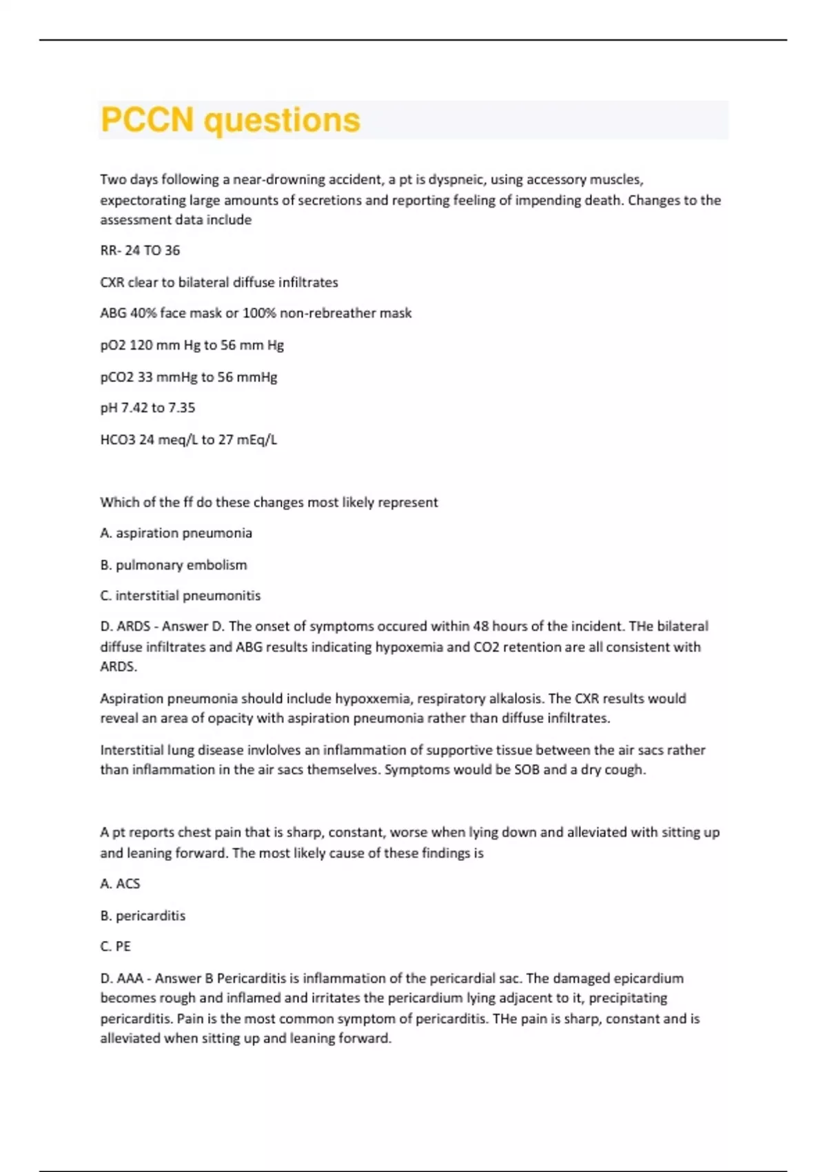 Two days following a near-drowning accident, a pt is dyspneic, using accessory muscles, expectorating large amounts of secretions and reporting feeling of impending death. Changes to the assessment data include RR- 24 TO 36 CXR clear to bilateral diffuse infiltrates ABG 40% face mask or 100% non-rebreather mask pO2 120 mm Hg to 56 mm Hg pCO2 33 mmHg to 56 mmHg pH 7.42 to 7.35 HCO3 24 meq/L to 27 mEq/L Which of the ff do these changes most likely represent A. aspiration pneumonia B. pulmonary embolism C. interstitial pneumonitis D. ARDS - Answer D. The onset of symptoms occured within 48 hours of the incident. THe bilateral diffuse infiltrates and ABG results indicating hypoxemia and CO2 retention are all consistent with ARDS. Aspiration pneumonia should include hypoxxemia, respiratory alkalosis. The CXR results would reveal an area of opacity with aspiration pneumonia rather than diffuse infiltrates. Interstitial lung disease invlolves an inflammation of supportive tissue between the air sacs rather than inflammation in the air sacs themselves. Symptoms would be SOB and a dry cough. A pt reports chest pain that is sharp, constant, worse when lying down and alleviated with sitting up and leaning forward. The most likely cause of these findings is A. ACS B. pericarditis C. PE D. AAA - Answer B Pericarditis is inflammation of the pericardial sac. The damaged epicardium becomes rough and inflamed and irritates the pericardium lying adjacent to it, precipitating pericarditis. Pain is the most common symptom of pericarditis. THe pain is sharp, constant and is alleviated when sitting up and leaning forward.A pt tells a nurse, "I don't know how I'm going to pay for this hospitalization." The nurse should A. arrange a meeting with hospital social services staff B. Notify the business office so a payment plan can be designed C. redirect the pt toward meeting psychologic needs D. give the pt applications for public assistance medical coverage - Answer A. Collaboration with a social worker is indicated in this case the social worker can assist the pt in identifying ways to address the financial implications of this hospitalization and help identify methods of payments. A cardiac pt with with DNR status is being managed medically. The nurse notes a new cough, thick yellow sputum and a temperature of 101.4 (38.4) Coarse crackles are present in the right upper field. The nurse should most immediately anticipate A. blood and sputum cultures followed by a broad spectrum abx B. mucolytics and judicious IV fluid administration C. an antyipyretic and conservative management D. NPO status and encouragement of frequent activity - Answer A. This pt symptoms are consistent with pneumonia. Management should include abx therapy, oxygen therapy for hypoxemia, mechanical ventilation if acute respiratory failure develops, fluid management for hydration, nutritional support, and treatment of associated medical problems and complications.