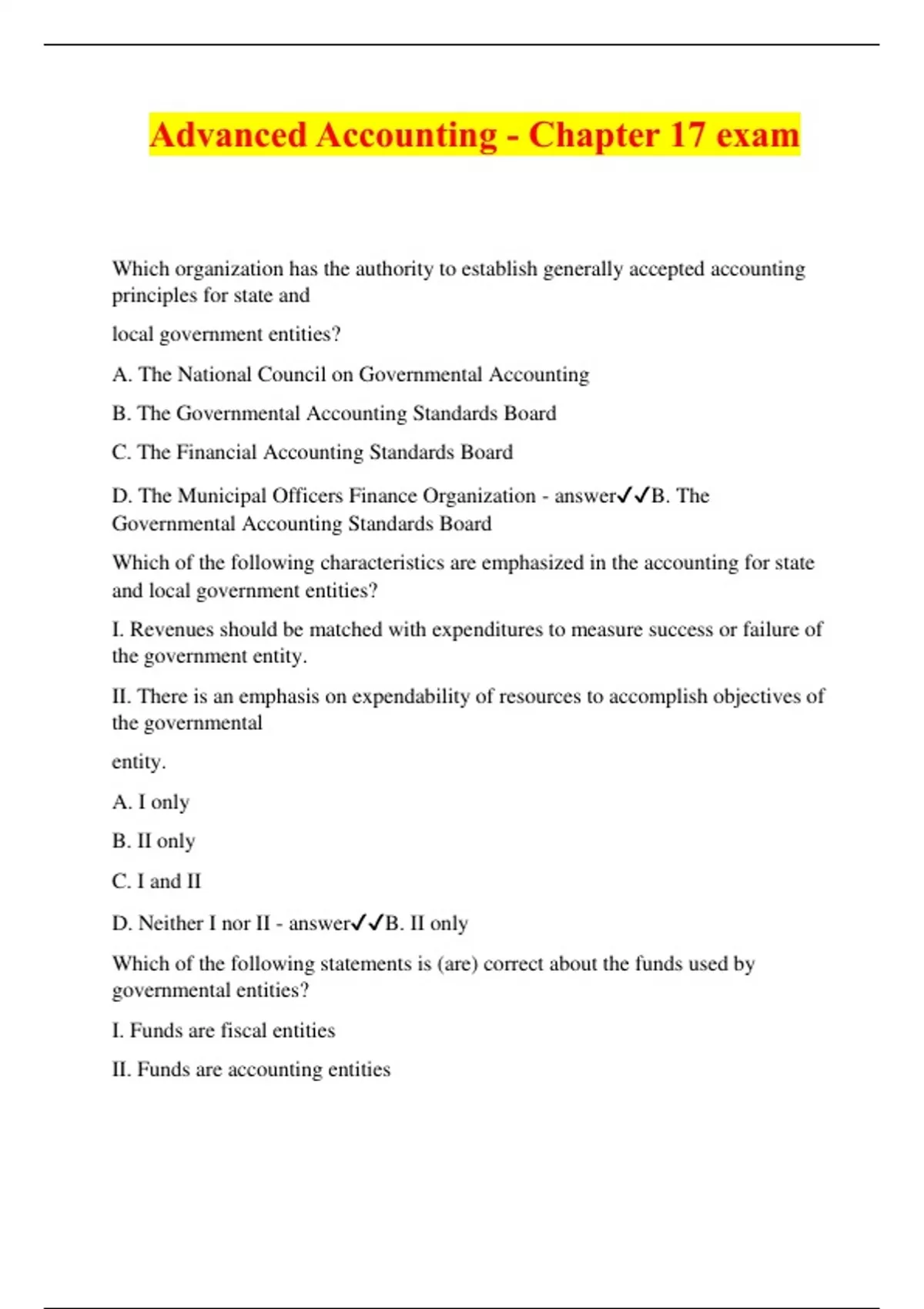 Advanced Accounting - Chapter 17 exam Which organization has the authority to establish generally accepted accounting principles for state and local government entities? A. The National Council on Governmental Accounting B. The Governmental Accounting Standards Board C. The Financial Accounting Standards Board D. The Municipal Officers Finance Organization - answerB. The Governmental Accounting Standards Board Which of the following characteristics are emphasized in the accounting for state and local government entities? I. Revenues should be matched with expenditures to measure success or failure of the government entity. II. There is an emphasis on expendability of resources to accomplish objectives of the governmental entity. A. I only B. II only C. I and II D. Neither I nor II - answerB. II only Which of the following statements is (are) correct about the funds used by governmental entities? I. Funds are fiscal entities II. Funds are accounting entities