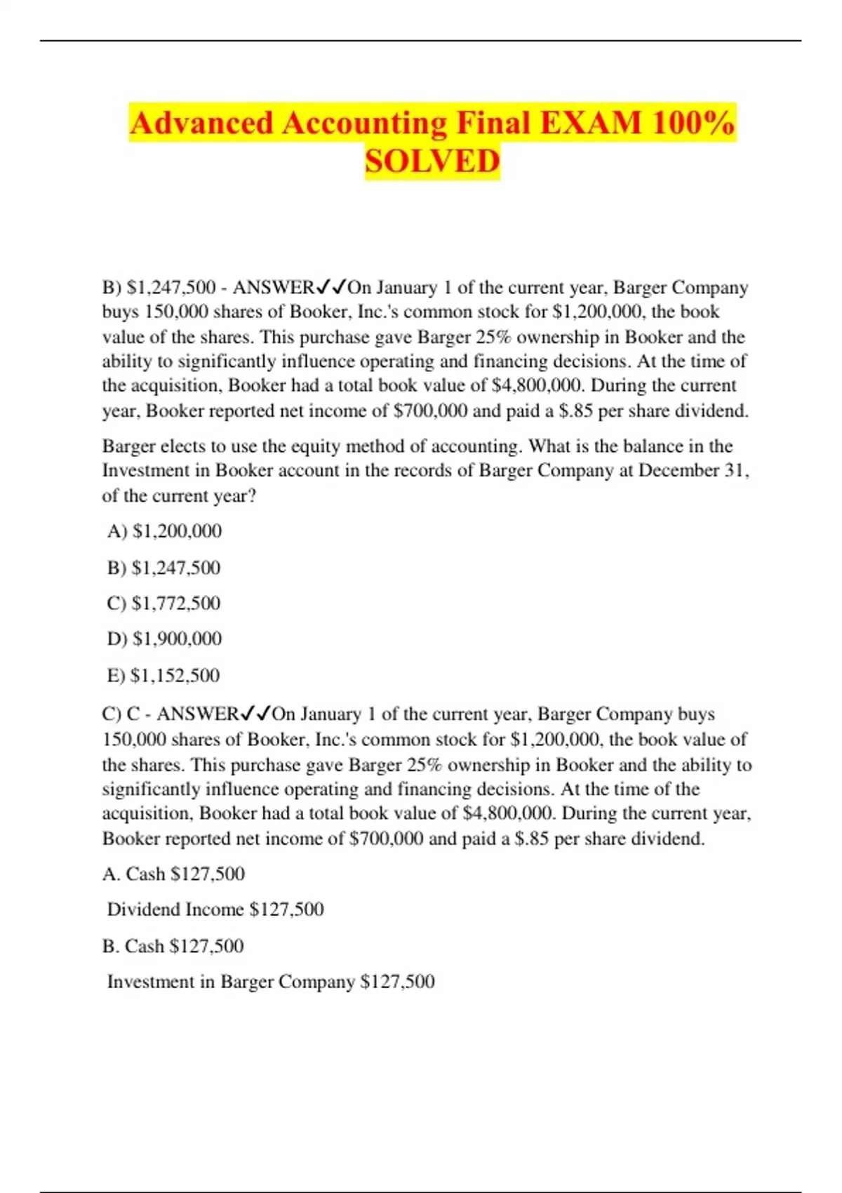 Advanced Accounting Final EXAM 100% SOLVED B) $1,247,500 - ANSWEROn January 1 of the current year, Barger Company buys 150,000 shares of Booker, Inc.'s common stock for $1,200,000, the book value of the shares. This purchase gave Barger 25% ownership in Booker and the ability to significantly influence operating and financing decisions. At the time of the acquisition, Booker had a total book value of $4,800,000. During the current year, Booker reported net income of $700,000 and paid a $.85 per share dividend. Barger elects to use the equity method of accounting. What is the balance in the Investment in Booker account in the records of Barger Company at December 31, of the current year? A) $1,200,000 B) $1,247,500 C) $1,772,500 D) $1,900,000 E) $1,152,500 C) C - ANSWEROn January 1 of the current year, Barger Company buys 150,000 shares of Booker, Inc.'s common stock for $1,200,000, the book value of the shares. This purchase gave Barger 25% ownership in Booker and the ability to significantly influence operating and financing decisions. At the time of the acquisition, Booker had a total book value of $4,800,000. During the current year, Booker reported net income of $700,000 and paid a $.85 per share dividend. A. Cash $127,500 Dividend Income $127,500 B. Cash $127,500 Investment in Barger Company $127,500 C. Cash $127,500 Investment in Booker, Inc. $127,500 D. Investment in Booker, Inc. $127,500 Dividend Income $127,500 E. Investment in Barger Company $127,500 Dividend Income $127,500 Using the equity method of accounting, what is the journal entry to record the receipt of dividends during the current year? A) A B) B C) C D) D E) E D) D - ANSWEROn January 1 of the current year, Barger Company buys 150,000 shares of Booker, Inc.'s common stock for $1,200,000, the book value of the shares. This purchase gave Barger 25% ownership in Booker and the ability to significantly influence operating and financing decisions. At the time of the acquisition, Booker had a total book value of $4,800,000. During the current year, Booker reported net income of $700,000 and paid a $.85 per share dividend. A. No entry is recorded B. Investment in Booker, Inc. $700,000 Equity in Investee Income $700,000 C. Investment in Barger Company $700,00 Equity in Investee Income $700,000 D. Investment in Booker, Inc. $175,000 Equity in Investee Income $175,000 E. Investment in Barger Company $175,000 Equity in Investee Income $175,000 Using the equity method of accounting, what is the journal entry to accrue the current year earnings? A) A B) B C) C D) D E) E D) $7,500.00 - ANSWERTara Company owns 30% of Hawkins, Inc. and applies the equity method. During the current year, Hawkins buys inventory costing $400,000 and sells it to Tara for $500,000. At the end of the year, only 25% of this merchandise is still being held by Tara. What amount of unrealized gain must be deferred by Hawkins in repo