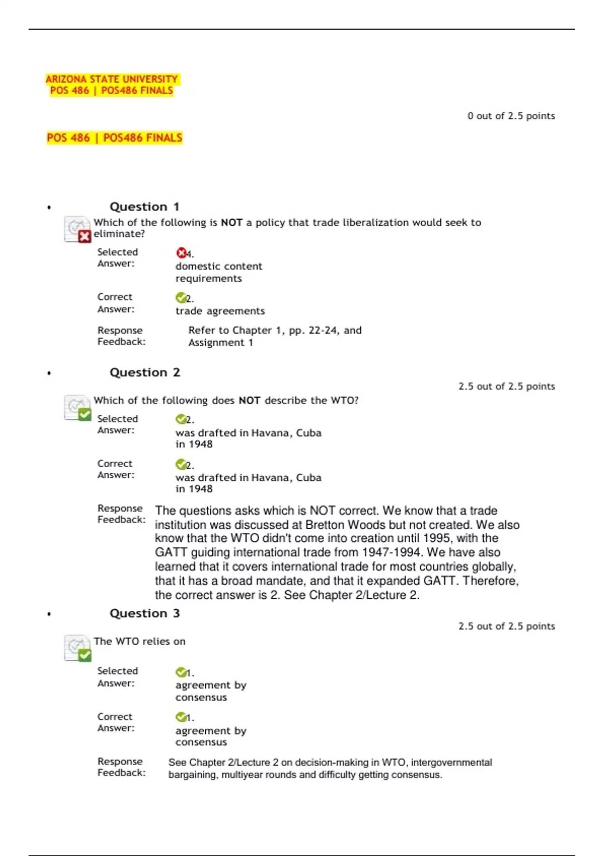 ARIZONA STATE UNIVERSITY POS 486 | POS486 FINALS POS 486 | POS486 FINALS • Question 1 0 out of 2.5 points Which of the following is NOT a policy that trade liberalization would seek to eliminate? Selected Answer: Correct Answer: Response Feedback: 4. domestic content requirements 2. trade agreements Refer to Chapter 1, pp. 22-24, and Assignment 1 • Question 2 Which of the following does NOT describe the WTO? 2.5 out of 2.5 points Selected Answer: Correct Answer: Response Feedback: 2. was drafted in Havana, Cuba in 1948 2. was drafted in Havana, Cuba in 1948 The questions asks which is NOT correct. We know that a trade institution was discussed at Bretton Woods but not created. We also know that the WTO didn't come into creation until 1995, with the GATT guiding international trade from . We have also learned that it covers international trade for most countries globally, that it has a broad mandate, and that it expanded GATT. Therefore, the correct answer is 2. See Chapter 2/Lecture 2. • Question 3 The WTO relies on 2.5 out of 2.5 points Selected Answer: Correct Answer: Response Feedback: 1. agreement by consensus 1. agreement by consensus See Chapter 2/Lecture 2 on decision-making in WTO, intergovernmental bargaining, multiyear rounds and difficulty getting consensus. • Question 4 The majority of regional trade agreements 2.5 out of 2.5 points Selected Answer: Correct Answer: Response Feedback: 4. are Free Trade Areas 4. are Free Trade Areas See Chapter 2. For those of us who are visual learners, Oatley has provided quite a graphic representation on p. 37. • Question 5 The enforcement problem of trade agreements refers to the fact that 2.5 out of 2.5 points Selected Answer: Correct Answer: Response Feedback: 2. governments cannot be certain that other governments will comply with the trade agreements they conclude 2. governments cannot be certain that other governments will comply with the trade agreements they conclude Refer to pp. 58-59