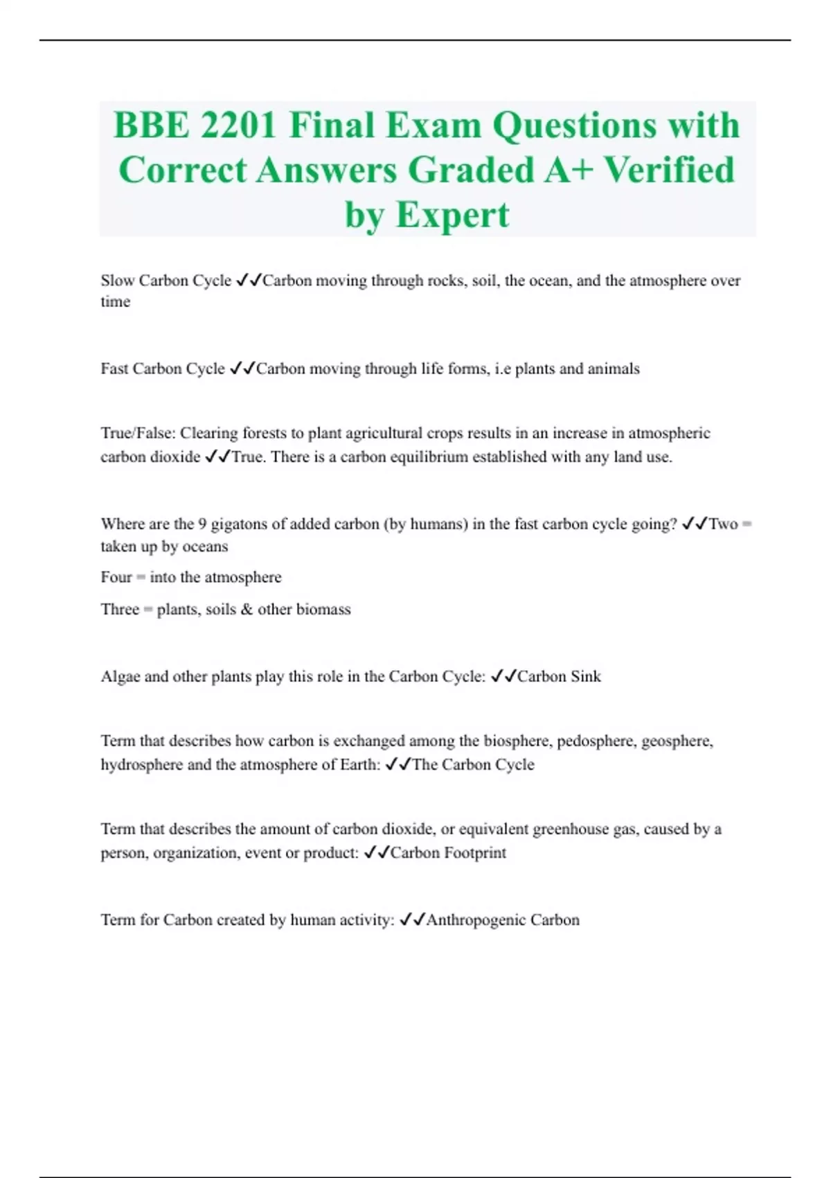 BBE 2201 Final Exam Questions with Correct Answers Graded A+ Verified by Expert Slow Carbon Cycle Carbon moving through rocks, soil, the ocean, and the atmosphere over time Fast Carbon Cycle Carbon moving through life forms, i.e plants and animals True/False: Clearing forests to plant agricultural crops results in an increase in atmospheric carbon dioxide True. There is a carbon equilibrium established with any land use. Where are the 9 gigatons of added carbon (by humans) in the fast carbon cycle going? Two = taken up by oceans Four = into the atmosphere Three = plants, soils & other biomass Algae and other plants play this role in the Carbon Cycle: Carbon Sink Term that describes how carbon is exchanged among the biosphere, pedosphere, geosphere, hydrosphere and the atmosphere of Earth: The Carbon Cycle Term that describes the amount of carbon dioxide, or equivalent greenhouse gas, caused by a person, organization, event or product: Carbon Footprint