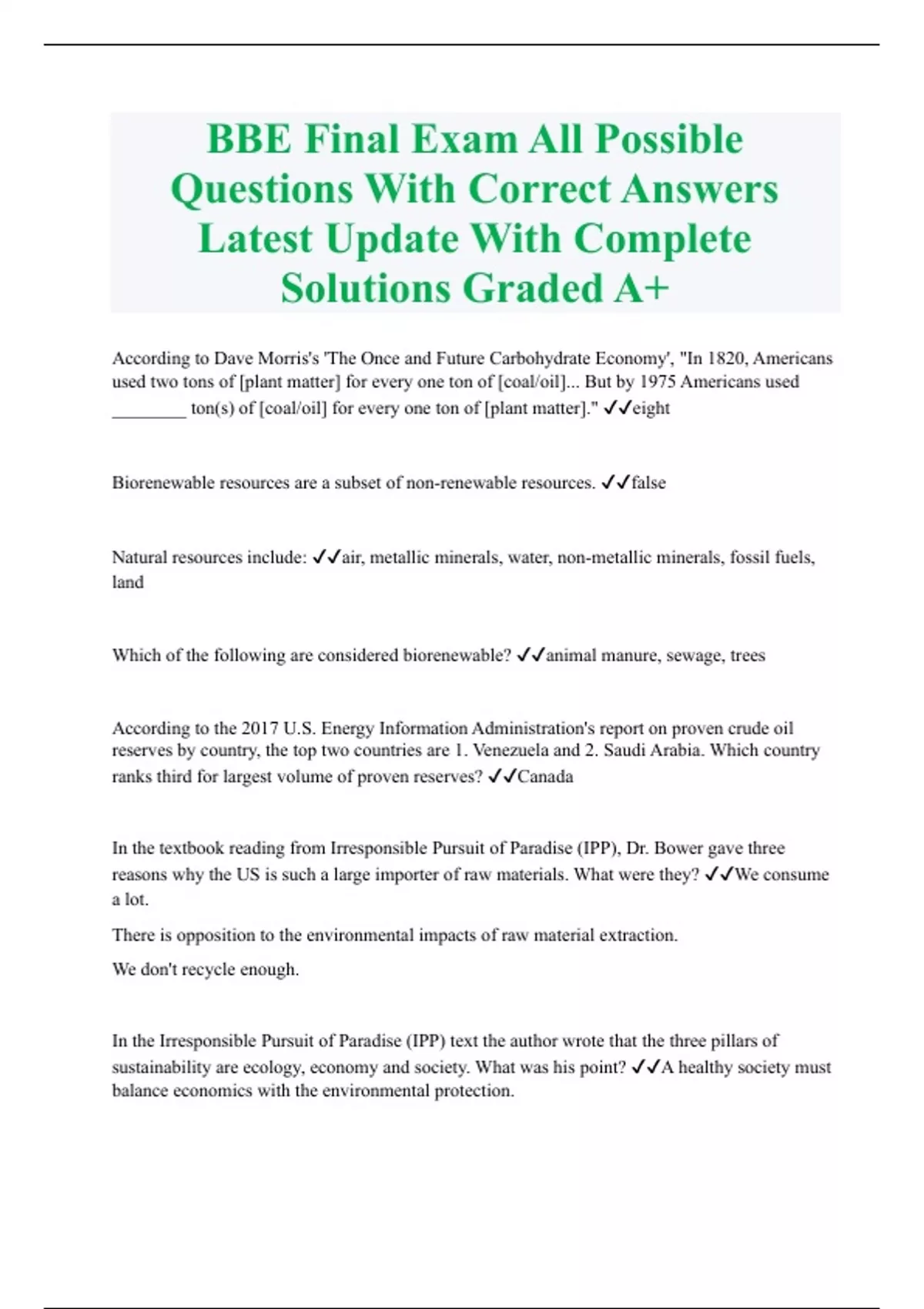 BBE Final Exam All Possible Questions With Correct Answers Latest Update With Complete Solutions Graded A+ According to Dave Morris's 'The Once and Future Carbohydrate Economy', "In 1820, Americans used two tons of [plant matter] for every one ton of [coal/oil]... But by 1975 Americans used ________ ton(s) of [coal/oil] for every one ton of [plant matter]." eight Biorenewable resources are a subset of non-renewable resources. false Natural resources include: air, metallic minerals, water, non-metallic minerals, fossil fuels, land Which of the following are considered biorenewable? animal manure, sewage, trees According to the 2017 U.S. Energy Information Administration's report on proven crude oil reserves by country, the top two countries are 1. Venezuela and 2. Saudi Arabia. Which country ranks third for largest volume of proven reserves? Canada In the textbook reading from Irresponsible Pursuit of Paradise (IPP), Dr. Bower gave three reasons why the US is such a large importer of raw materials. What were they? We consume a lot. There is opposition to the environmental impacts of raw material extraction. We don't recycle enough. In the Irresponsible Pursuit of Paradise (IPP) text the author wrote that the three pillars of sustainability are ecology, economy and society. What was his point? A healthy society must balance economics with the environmental protection.