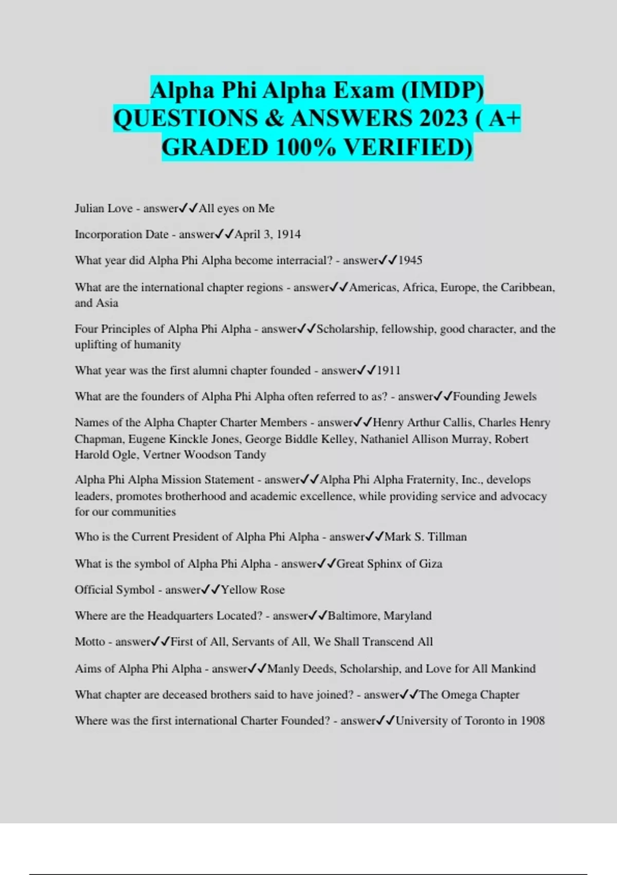 Alpha Phi Alpha Exam (IMDP) QUESTIONS & ANSWERS 2023 ( A+ GRADED 100% VERIFIED) Julian Love - answerAll eyes on Me Incorporation Date - answerApril 3, 1914 What year did Alpha Phi Alpha become interracial? - answer1945 What are the international chapter regions - answerAmericas, Africa, Europe, the Caribbean, and Asia Four Principles of Alpha Phi Alpha - answerScholarship, fellowship, good character, and the uplifting of humanity What year was the first alumni chapter founded - answer1911 What are the founders of Alpha Phi Alpha often referred to as? - answerFounding Jewels Names of the Alpha Chapter Charter Members - answerHenry Arthur Callis, Charles Henry Chapman, Eugene Kinckle Jones, George Biddle Kelley, Nathaniel Allison Murray, Robert Harold Ogle, Vertner Woodson Tandy Alpha Phi Alpha Mission Statement - answerAlpha Phi Alpha Fraternity, Inc., develops leaders, promotes brotherhood and academic excellence, while providing service and advocacy for our communities Who is the Current President of Alpha Phi Alpha - answerMark S. Tillman What is the symbol of Alpha Phi Alpha - answerGreat Sphinx of Giza Official Symbol - answerYellow Rose Where are the Headquarters Located? - answerBaltimore, Maryland Motto - answerFirst of All, Servants of All, We Shall Transcend All Aims of Alpha Phi Alpha - answerManly Deeds, Scholarship, and Love for All Mankind What chapter are deceased brothers said to have joined? - answerThe Omega Chapter Where was the first international Charter Founded? - answerUniversity of Toronto in 1908