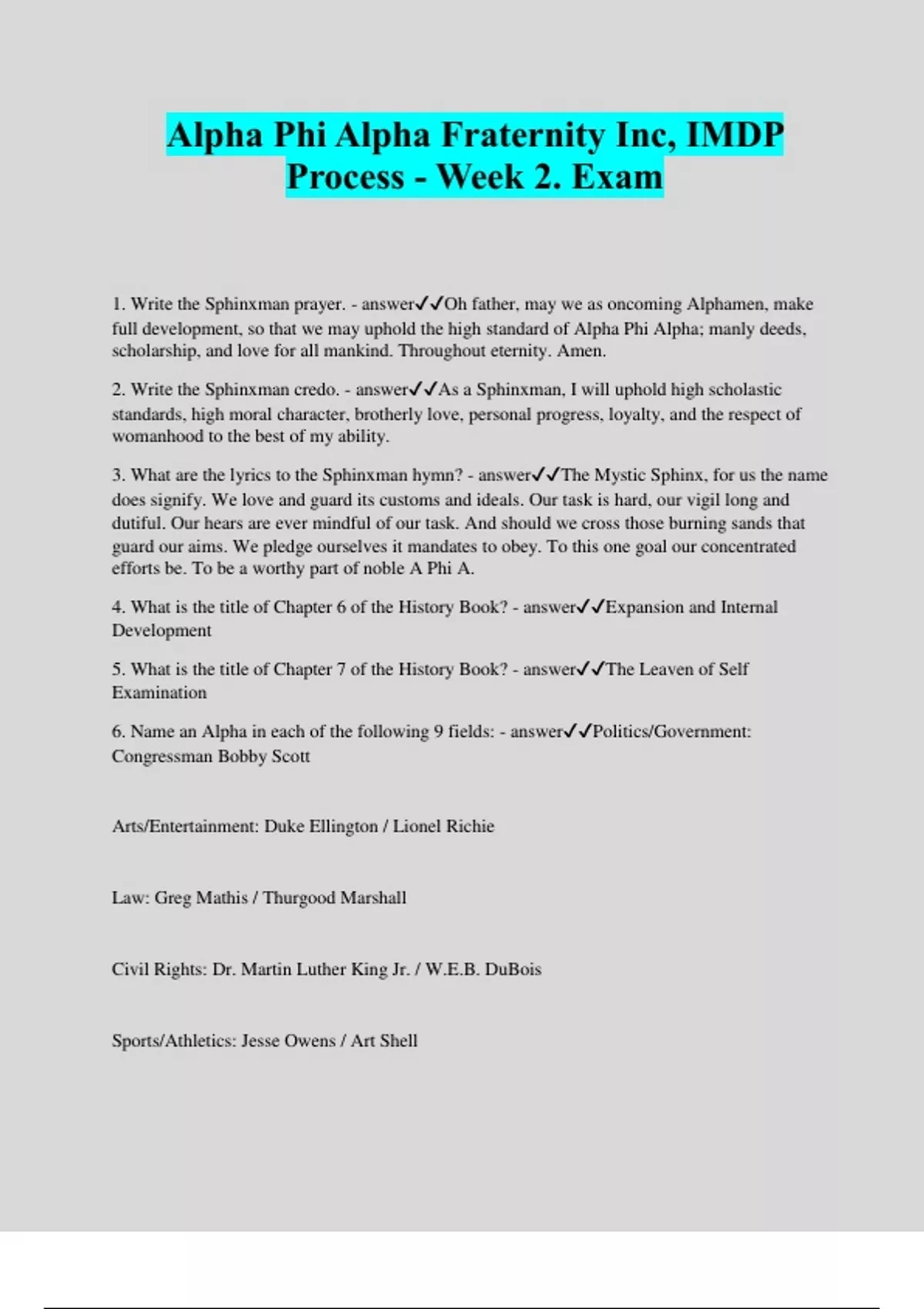 Alpha Phi Alpha Fraternity Inc, IMDP Process - Week 2. Exam 1. Write the Sphinxman prayer. - answerOh father, may we as oncoming Alphamen, make full development, so that we may uphold the high standard of Alpha Phi Alpha; manly deeds, scholarship, and love for all mankind. Throughout eternity. Amen. 2. Write the Sphinxman credo. - answerAs a Sphinxman, I will uphold high scholastic standards, high moral character, brotherly love, personal progress, loyalty, and the respect of womanhood to the best of my ability. 3. What are the lyrics to the Sphinxman hymn? - answerThe Mystic Sphinx, for us the name does signify. We love and guard its customs and ideals. Our task is hard, our vigil long and dutiful. Our hears are ever mindful of our task. And should we cross those burning sands that guard our aims. We pledge ourselves it mandates to obey. To this one goal our concentrated efforts be. To be a worthy part of noble A Phi A. 4. What is the title of Chapter 6 of the History Book? - answerExpansion and Internal Development 5. What is the title of Chapter 7 of the History Book? - answerThe Leaven of Self Examination 6. Name an Alpha in each of the following 9 fields: - answerPolitics/Government: Congressman Bobby Scot