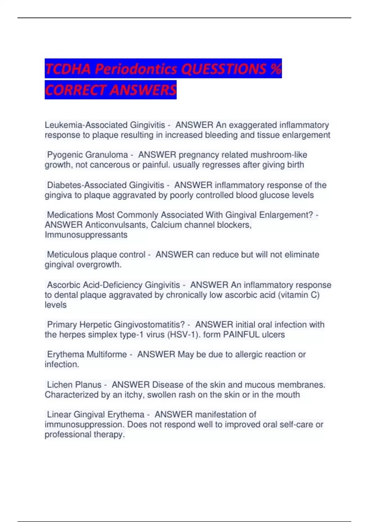 TCDHA Periodontics QUESSTIONS % CORRECT ANSWERS Leukemia-Associated Gingivitis - ANSWER An exaggerated inflammatory response to plaque resulting in increased bleeding and tissue enlargement Pyogenic Granuloma - ANSWER pregnancy related mushroom-like growth, not cancerous or painful. usually regresses after giving birth Diabetes-Associated Gingivitis - ANSWER inflammatory response of the gingiva to plaque aggravated by poorly controlled blood glucose levels Medications Most Commonly Associated With Gingival Enlargement? - ANSWER Anticonvulsants, Calcium channel blockers, Immunosuppressants Meticulous plaque control - ANSWER can reduce but will not eliminate gingival overgrowth. Ascorbic Acid-Deficiency Gingivitis - ANSWER An inflammatory response to dental plaque aggravated by chronically low ascorbic acid (vitamin C) levels Primary Herpetic Gingivostomatitis? - ANSWER initial oral infection with the herpes simplex type-1 virus (HSV-1). form PAINFUL ulcers Erythema Multiforme - ANSWER May be due to allergic reaction or infection. Lichen Planus - ANSWER Disease of the skin and mucous membranes. Characterized by an itchy, swollen rash on the skin or in the mouth Linear Gingival Erythema - ANSWER manifestation of immunosuppression. Does not respond well to improved oral self-care or professional therapy. two flavor additives known to cause allergic reactions of the gingiva? - ANSWER Cinnamon and carvone Acute gingivitis - ANSWER short duration; resolves upon professional and good self-care. Chronic gingivitis - ANSWER may exist for years without ever progressing to periodontitis; resolves upon professional and good self-care peri-implant gingivitis - ANSWER inflammatory conditions affecting the soft and hard gum tissues around dental implants Plaque-Induced Gingival diseases - ANSWER periodontal diseases involving inflammation of the gingiva in response to dental plaque is plaque induced gingival disease reversible? - ANSWER yes, with good patient self-care plaque-induced gingival disease radiographs? - ANSWER Reveal no changes in height or character of the bone Gingival diseases modified by systemic factors? - ANSWER plaque initiates the disease and then specific systemic factors found in the host modify the disease process. Example: puberty, pregnancy, diabetes, leukemia Gingival diseases modified by medications-Gingival Enlargement - ANSWER Onset within 3 months, higher prevalence in children, gingiva on anterior sextants most commonly affected. first observed at the interdental papilla. Non-Plaque-Induced Gingival lesions - ANSWER manifestation of immunosuppression. Does not respond well to improved oral self-care or professional therapy Chronic periodontitis Signs and symptoms - ANSWER Pain usually is NOT a symptom. Clinical appearance is NOT a reliable indicator of the presence or severity of chronic periodontitis Chronic periodontitis - ANSWER most common form, Irreversible loss of attachment bone. slight chronic periodontitis - ANSWER no more than 1 to 2mm of clinical attachment loss moderate chronic periodontitis - ANSWER 3-4 mm of clinical attachment loss Severe chronic periodontitis - ANSWER 5 mm or more of clinical attachment loss Recurrent Chronic Periodontitis - ANSWER new signs of destructive periodontitis that reappear after therapy Aggressive Periodontitis - ANSWER bacterial infection characterized by rapid destruction of Periodontal ligament, Supporting alveolar bone