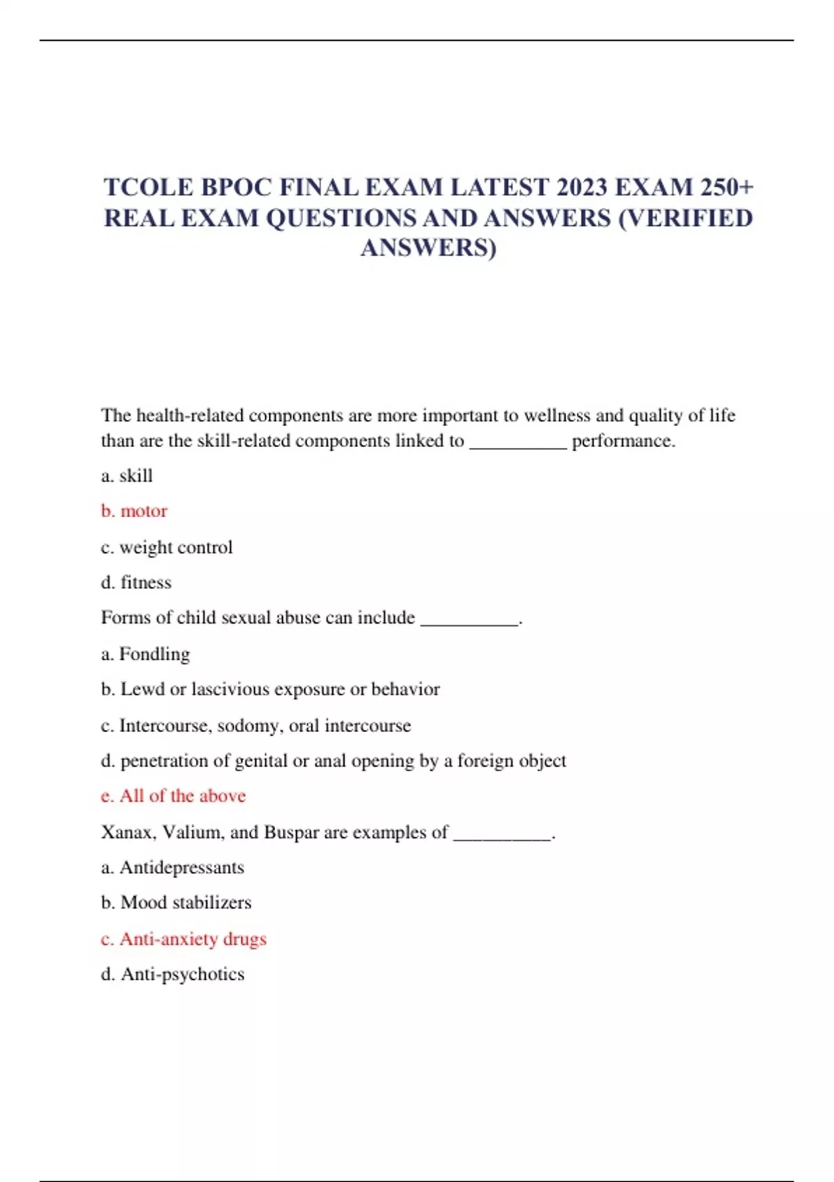 TCOLE BPOC FINAL EXAM LATEST 2023 EXAM 250+ REAL EXAM QUESTIONS AND ANSWERS (VERIFIED ANSWERS) The health-related components are more important to wellness and quality of life than are the skill-related components linked to __________ performance. a. skill b. motor c. weight control d. fitness Forms of child sexual abuse can include __________. a. Fondling b. Lewd or lascivious exposure or behavior c. Intercourse, sodomy, oral intercourse d. penetration of genital or anal opening by a foreign object e. All of the above Xanax, Valium, and Buspar are examples of __________. a. Antidepressants b. Mood stabilizers c. Anti-anxiety drugs d. Anti-psychotics Steroid abuse can result in physical and psychological change, including, but not limited to __________. a. adverse complications of lower back injury b. raised triglycerol level in the blood c. stimulation of the central nervous system d. improving the ability of the liver to eliminate waste from the body __________ means the referral of a child or a child's case to the office or official, including an intake officer or probation officer, designated by the juvenile board to process children within the juvenile justice system. a. Reference to minor court b. Referral to minor court c. Juvenile court referral d. Referral to juvenile court An individual who displays which of the following behaviors is the most likely in crisis? a. Calm demeanor b. Good hygiene c. Not responding to verbal commands d. Speaking coherently A person commits which offense if he makes a bet on the partial or final result of a game or contest or on the performance of a participant in a game or contest? (8) Select one: a. Gambling b. Gambling Promotion c. Keeping a Gambling Place d. Any of the above Joe caused the death of Louis due to criminal negligence. Joe could be charged with which of the following? (8) Select one: a. Manslaughter b. Murder 1st Degree c. Murder 2nd Degree d. Capital Murder e. None of the above If the person is younger than 21 years of age and has ________ of alcohol in the person's system, the person's license to operate a motor vehicle will be automatically suspended for not less than 60 days even if the person submits to the taking of the specimen. (23) Select one: a. 0.000001 b. 0.0008 c. Any amount d. 0.00001 In the definition of wellness, there are varying degrees of wellness ranging from __________. (3) Select one: a. good health to bad health b. fit to eat c. death to optimal well-being d. weak to strong e. bad health to good health When conducting a crime scene search, a strip search is among the most edective for __________ searches. (32) Select one: a. outside b. inside c. suspect d. vehicle Amendment 5 to the constitution __________. (7) Select one: a. Individual Rights b. Excessive bail, excessive Dnes, cruel and unusual punishment c. Double jeopardy, witness against self, due process, self-incrimination d. Right to trial, nature of odense, confronting accusers, right to counsel
