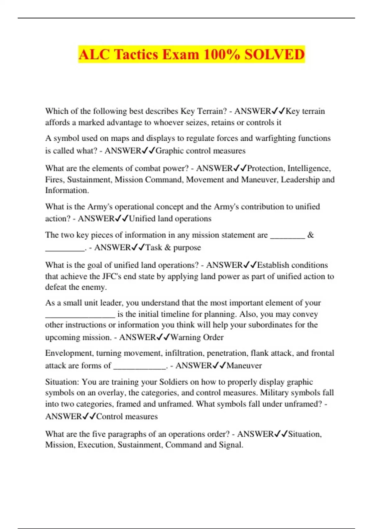 ALC Tactics Exam 100% SOLVED Which of the following best describes Key Terrain? - ANSWERKey terrain affords a marked advantage to whoever seizes, retains or controls it A symbol used on maps and displays to regulate forces and warfighting functions is called what? - ANSWERGraphic control measures What are the elements of combat power? - ANSWERProtection, Intelligence, Fires, Sustainment, Mission Command, Movement and Maneuver, Leadership and Information. What is the Army's operational concept and the Army's contribution to unified action? - ANSWERUnified land operations The two key pieces of information in any mission statement are ________ & _________. - ANSWERTask & purpose What is the goal of unified land operations? - ANSWEREstablish conditions that achieve the JFC's end state by applying land power as part of unified action to defeat the enemy. As a small unit leader, you understand that the most important element of your ________________ is the initial timeline for planning. Also, you may convey other instructions or information you think will help your subordinates for the upcoming mission. - ANSWERWarning Order Envelopment, turning movement, infiltration, penetration, flank attack, and frontal attack are forms of ____________. - ANSWERManeuver Situation: You are training your Soldiers on how to properly display graphic symbols on an overlay, the categories, and control measures. Military symbols fall into two categories, framed and unframed. What symbols fall under unframed? - ANSWERControl measures What are the five paragraphs of an operations order? - ANSWERSituation, Mission, Execution, Sustainment, Command and Signal