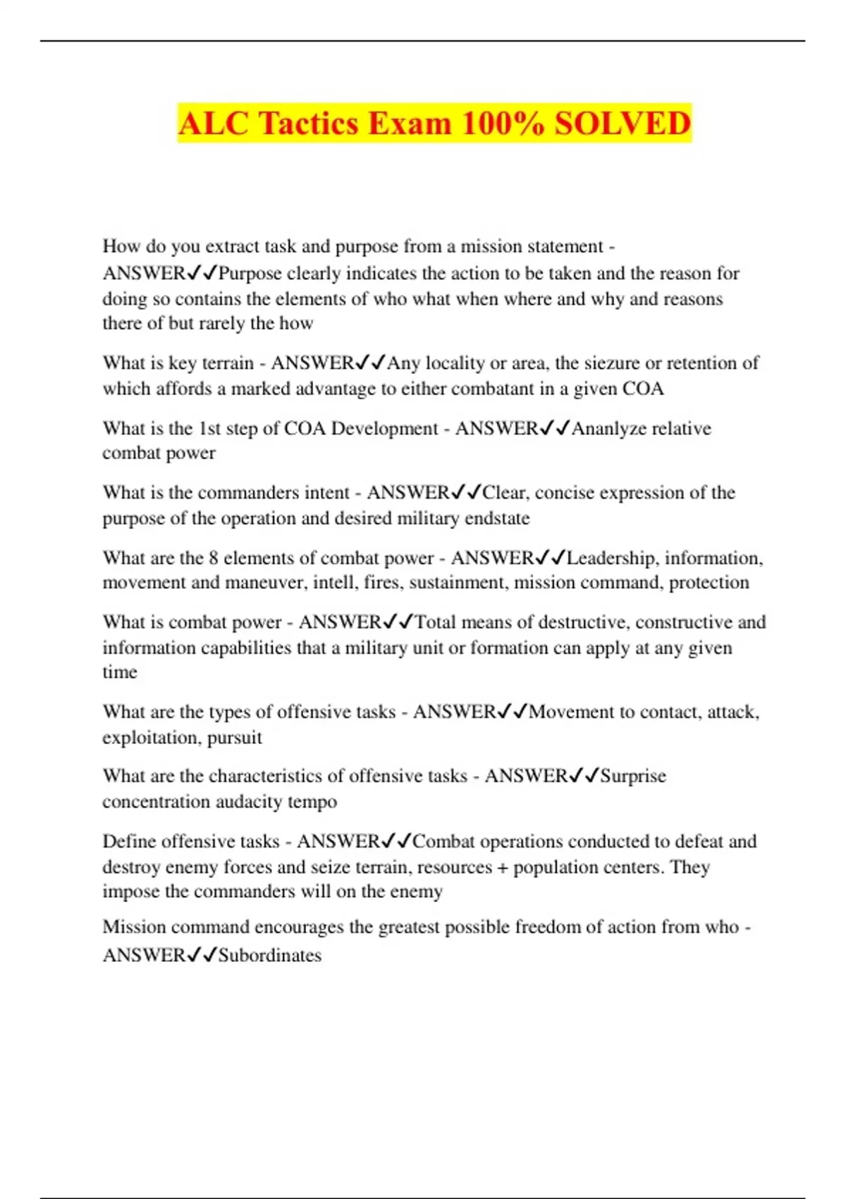 ALC Tactics Exam 100% SOLVED How do you extract task and purpose from a mission statement - ANSWERPurpose clearly indicates the action to be taken and the reason for doing so contains the elements of who what when where and why and reasons there of but rarely the how What is key terrain - ANSWERAny locality or area, the siezure or retention of which affords a marked advantage to either combatant in a given COA What is the 1st step of COA Development - ANSWERAnanlyze relative combat power What is the commanders intent - ANSWERClear, concise expression of the purpose of the operation and desired military endstate What are the 8 elements of combat power - ANSWERLeadership, information, movement and maneuver, intell, fires, sustainment, mission command, protection What is combat power - ANSWERTotal means of destructive, constructive and information capabilities that a military unit or formation can apply at any given time What are the types of offensive tasks - ANSWERMovement to contact, attack, exploitation, pursuit What are the characteristics of offensive tasks - ANSWERSurprise concentration audacity tempo Define offensive tasks - ANSWERCombat operations conducted to defeat and destroy enemy forces and seize terrain, resources + population centers. They impose the commanders will on the enemy Mission command encourages the greatest possible freedom of action from who - ANSWERSubordinates