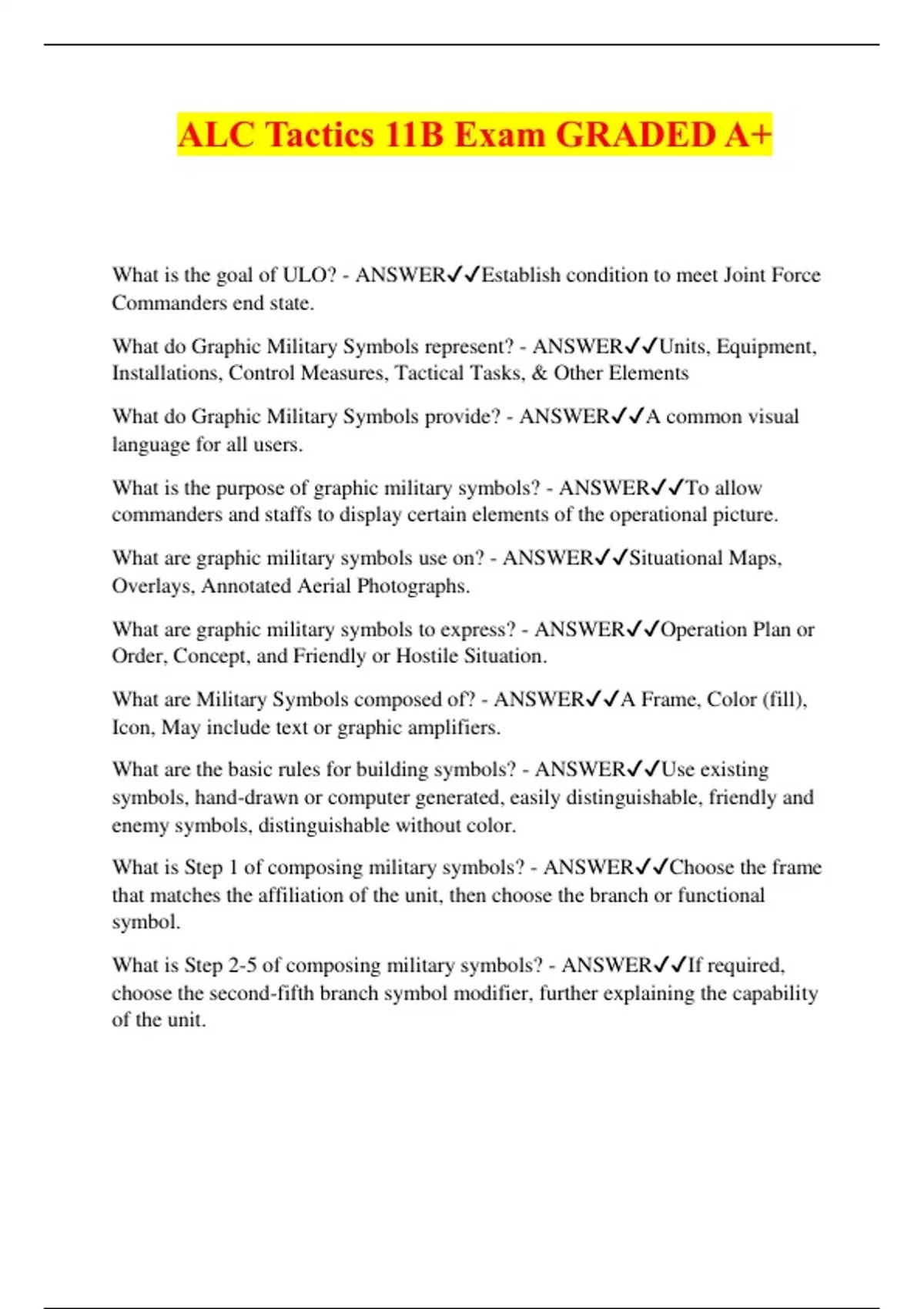 ALC Tactics 11B Exam GRADED A+ What is the goal of ULO? - ANSWEREstablish condition to meet Joint Force Commanders end state. What do Graphic Military Symbols represent? - ANSWERUnits, Equipment, Installations, Control Measures, Tactical Tasks, & Other Elements What do Graphic Military Symbols provide? - ANSWERA common visual language for all users. What is the purpose of graphic military symbols? - ANSWERTo allow commanders and staffs to display certain elements of the operational picture. What are graphic military symbols use on? - ANSWERSituational Maps, Overlays, Annotated Aerial Photographs. What are graphic military symbols to express? - ANSWEROperation Plan or Order, Concept, and Friendly or Hostile Situation. What are Military Symbols composed of? - ANSWERA Frame, Color (fill), Icon, May include text or graphic amplifiers. What are the basic rules for building symbols? - ANSWERUse existing symbols, hand-drawn or computer generated, easily distinguishable, friendly and enemy symbols, distinguishable without color. What is Step 1 of composing military symbols? - ANSWERChoose the frame that matches the affiliation of the unit, then choose the branch or functional symbol. What is Step 2-5 of composing military symbols? - ANSWERIf required, choose the second-fifth branch symbol modifier, further explaining the capability of the unit