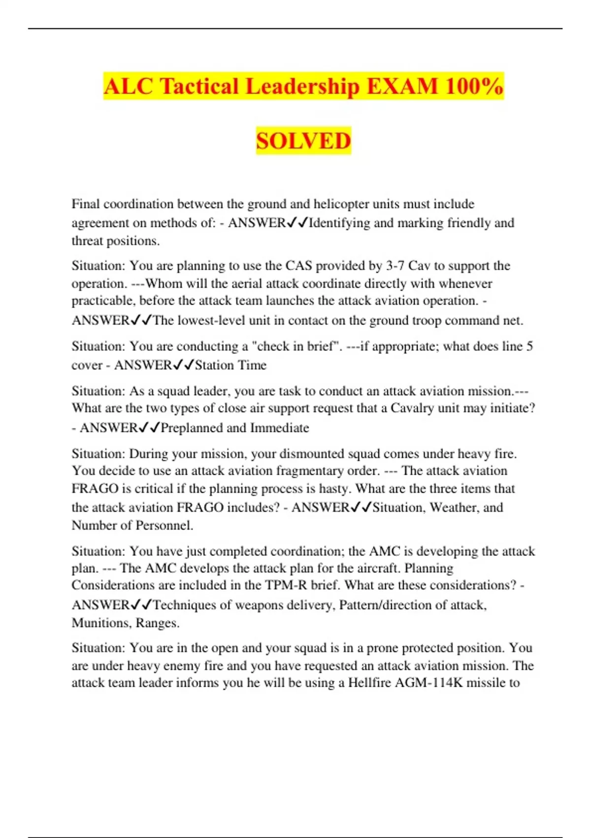 ALC Tactical Leadership EXAM 100% SOLVED Final coordination between the ground and helicopter units must include agreement on methods of: - ANSWERIdentifying and marking friendly and threat positions. Situation: You are planning to use the CAS provided by 3-7 Cav to support the operation. ---Whom will the aerial attack coordinate directly with whenever practicable, before the attack team launches the attack aviation operation. - ANSWERThe lowest-level unit in contact on the ground troop command net. Situation: You are conducting a "check in brief". ---if appropriate; what does line 5 cover - ANSWERStation Time Situation: As a squad leader, you are task to conduct an attack aviation mission.--- What are the two types of close air support request that a Cavalry unit may initiate? - ANSWERPreplanned and Immediate Situation: During your mission, your dismounted squad comes under heavy fire. You decide to use an attack aviation fragmentary order. --- The attack aviation FRAGO is critical if the planning process is hasty. What are the three items that the attack aviation FRAGO includes? - ANSWERSituation, Weather, and Number of Personnel. Situation: You have just completed coordination; the AMC is developing the attack plan. --- The AMC develops the attack plan for the aircraft. Planning Considerations are included in the TPM-R brief. What are these considerations? - ANSWERTechniques of weapons delivery, Pattern/direction of attack, Munitions, Ranges. Situation: You are in the open and your squad is in a prone protected position. You are under heavy enemy fire and you have requested an attack aviation mission. The attack team leader informs you he will be using a Hellfire AGM-114K missile to
