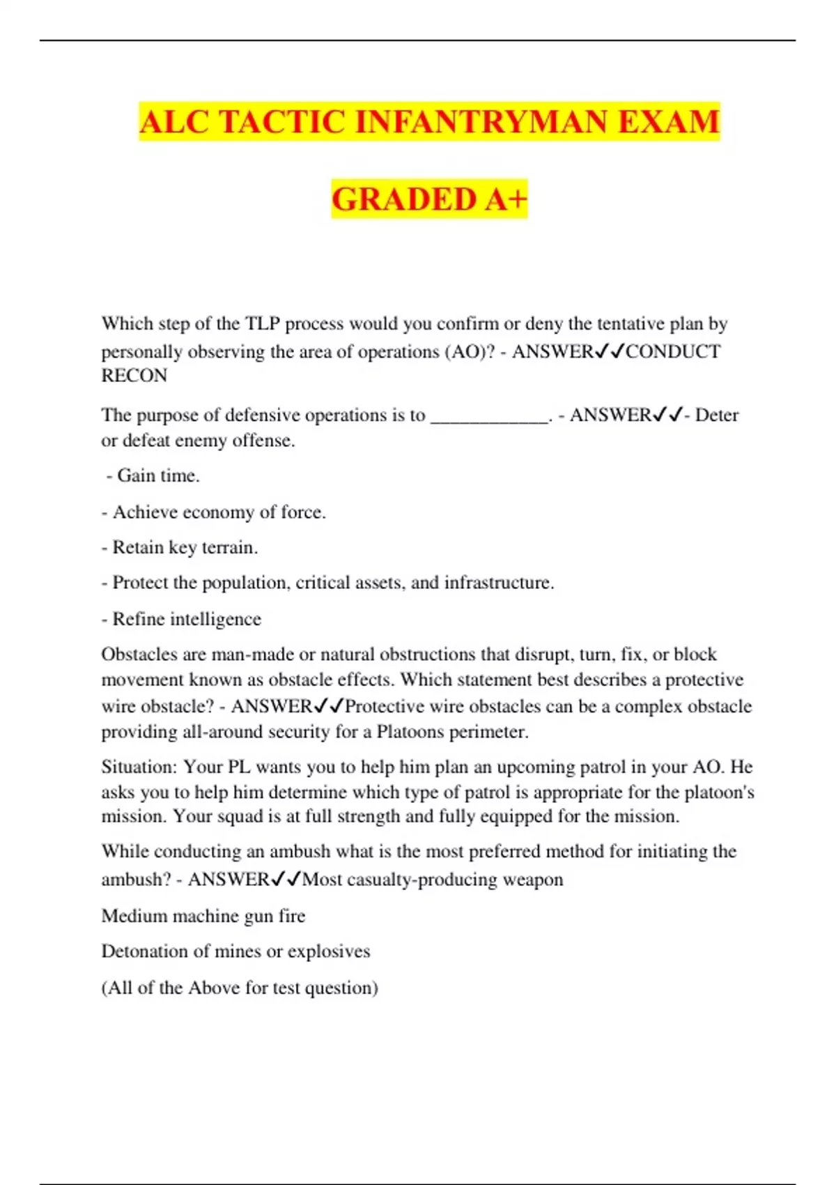 ALC TACTIC INFANTRYMAN EXAM GRADED A+ Which step of the TLP process would you confirm or deny the tentative plan by personally observing the area of operations (AO)? - ANSWERCONDUCT RECON The purpose of defensive operations is to ____________. - ANSWER- Deter or defeat enemy offense. - Gain time. - Achieve economy of force. - Retain key terrain. - Protect the population, critical assets, and infrastructure. - Refine intelligence Obstacles are man-made or natural obstructions that disrupt, turn, fix, or block movement known as obstacle effects. Which statement best describes a protective wire obstacle? - ANSWERProtective wire obstacles can be a complex obstacle providing all-around security for a Platoons perimeter. Situation: Your PL wants you to help him plan an upcoming patrol in your AO. He asks you to help him determine which type of patrol is appropriate for the platoon's mission. Your squad is at full strength and fully equipped for the mission. While conducting an ambush what is the most preferred method for initiating the ambush? - ANSWERMost casualty-producing weapon Medium machine gun fire Detonation of mines or explosives (All of the Above for test question) A patrol is a detachment sent out by a larger unit to conduct a specific combat, reconnaissance, or ____________ mission? - ANSWERSecurity Which of the following characteristics implies that the defender arrives in the area of operations before the attacker and uses the available time to prepare? - ANSWERPreparation While preparing to conduct a patrol you tell one of your squad leaders that a patrol requires a ________________? - ANSWERTask and Purpo