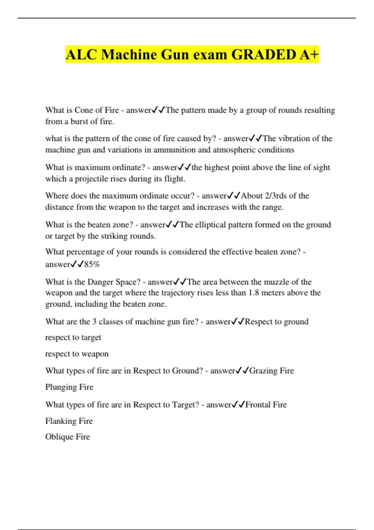 ALC Tactics 11B Exam GRADED A+ Definition of Tactics: - ANSWEREmployment of units in combat, includes the ordered arrangment and maneuver of units in relation to each other, the terrain and the enemy to translate potential combat power in victorious battles and engagements. What's is combat power? - ANSWERTotal means of destruction, construction, and information capabilities that a military unit can apply at a given time. What is Unified Land Operations? - ANSWERhow the army seizes, retains and exploits the initiative to gain and maintain a position of relative advantage in order to prevent and deter conflict resolution What are the Characteristics of defense? - ANSWERPreparation, security, disruption, massing effects, flexibility. What are the characteristics of offensive operations? - ANSWERSurprise, concentration, audacity and tempo What are the elements of combat power? - ANSWERLeadership, information, movement and maneuver, intelligence, fires, sustainment, mission, command, and protection What are the forms of maneuver? - ANSWEREnvelopment