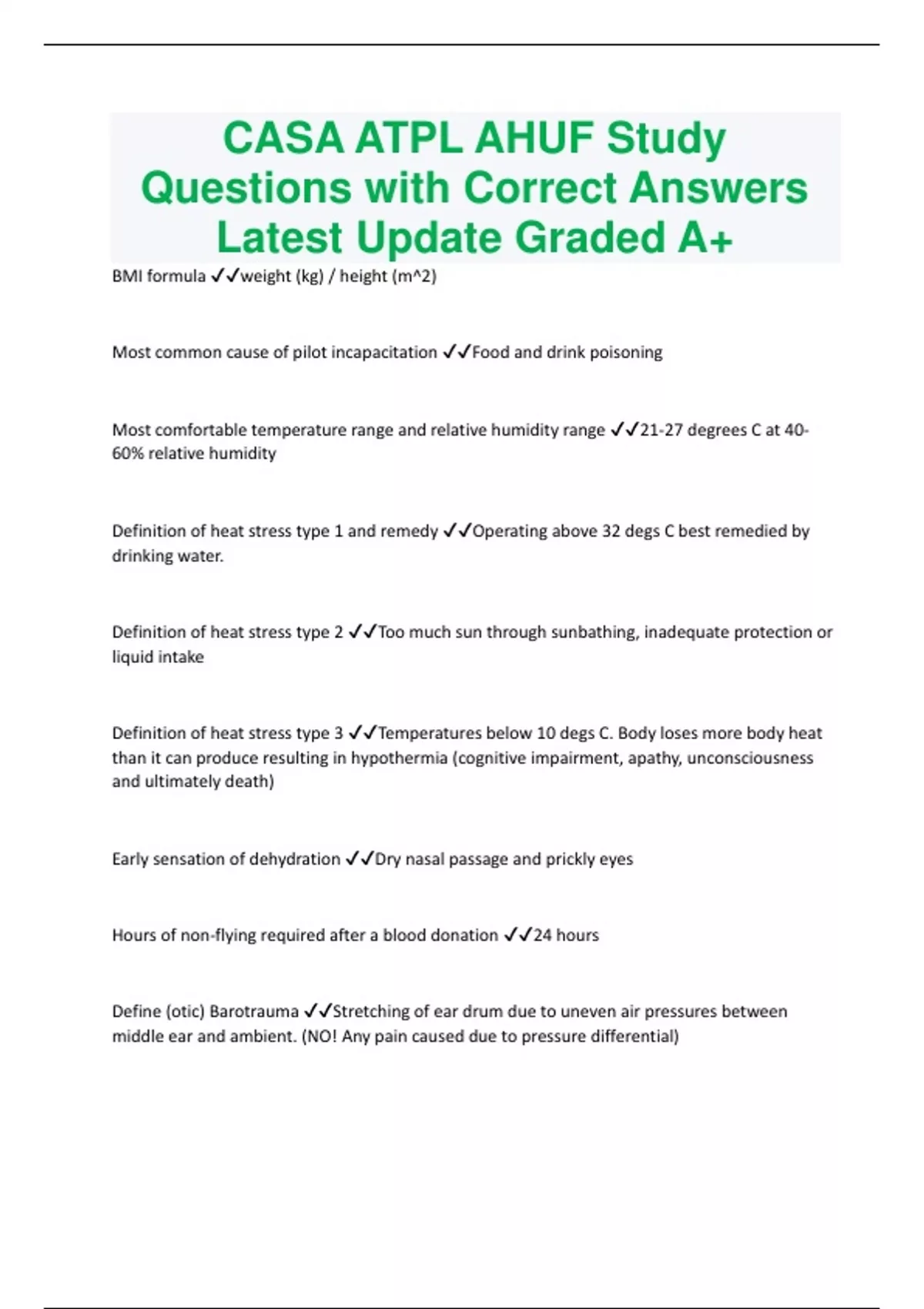 CASA ATPL AHUF Study Questions with Correct Answers Latest Update Graded A+ BMI formula weight (kg) / height (m^2) Most common cause of pilot incapacitation Food and drink poisoning Most comfortable temperature range and relative humidity range 21-27 degrees C at 40- 60% relative humidity Definition of heat stress type 1 and remedy Operating above 32 degs C best remedied by drinking water. Definition of heat stress type 2 Too much sun through sunbathing, inadequate protection or liquid intake Definition of heat stress type 3 Temperatures below 10 degs C. Body loses more body heat than it can produce resulting in hypothermia (cognitive impairment, apathy, unconsciousness and ultimately death) Early sensation of dehydration Dry nasal passage and prickly eyes Hours of non-flying required after a blood donation 24 hours Define (otic) Barotrauma Stretching of ear drum due to uneven air pressures between middle ear and ambient. (NO! Any pain caused due to pressure differential)