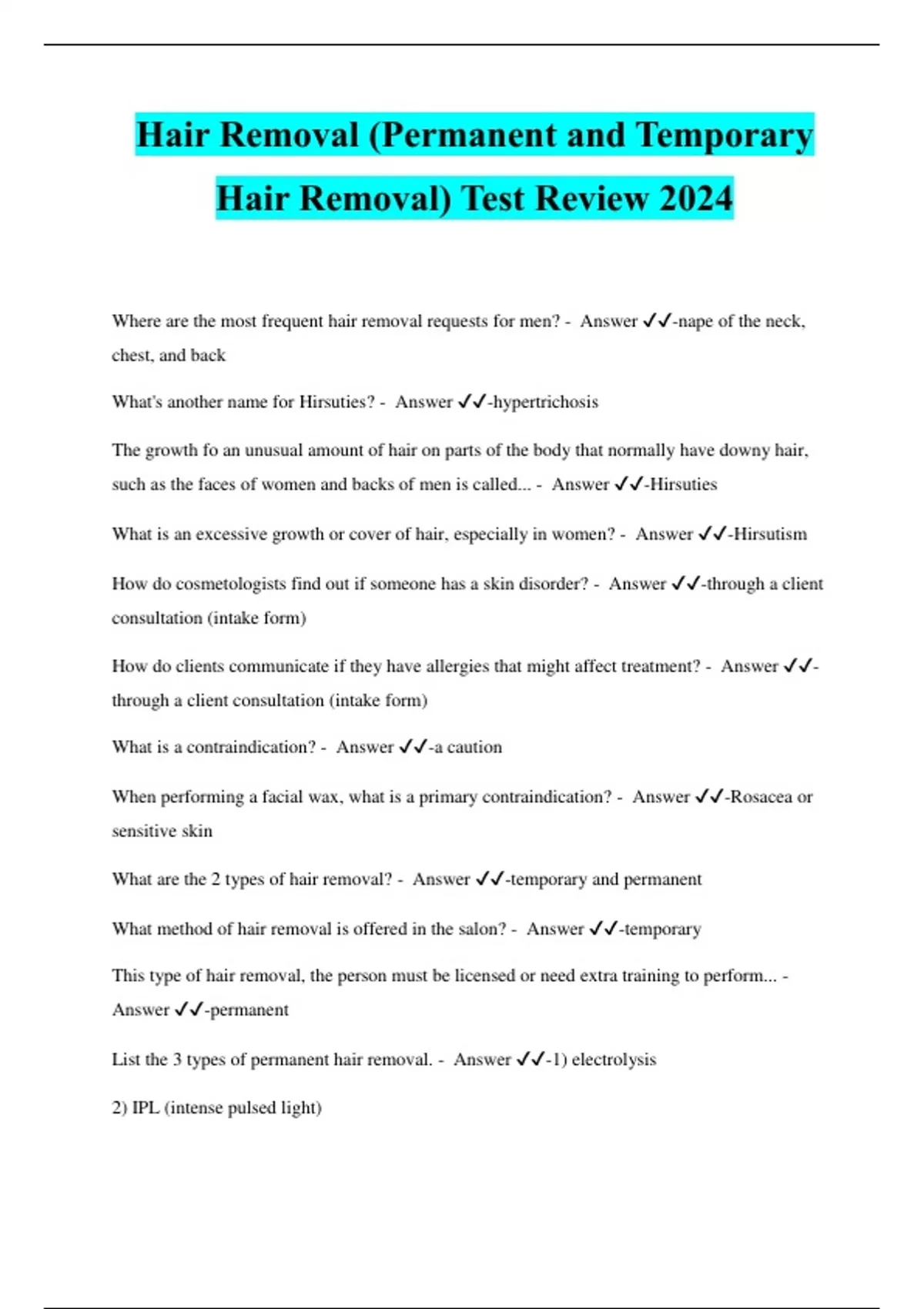 Where are the most frequent hair removal requests for men? - Answer ️️-nape of the neck, chest, and back What's another name for Hirsuties? - Answer ️️-hypertrichosis