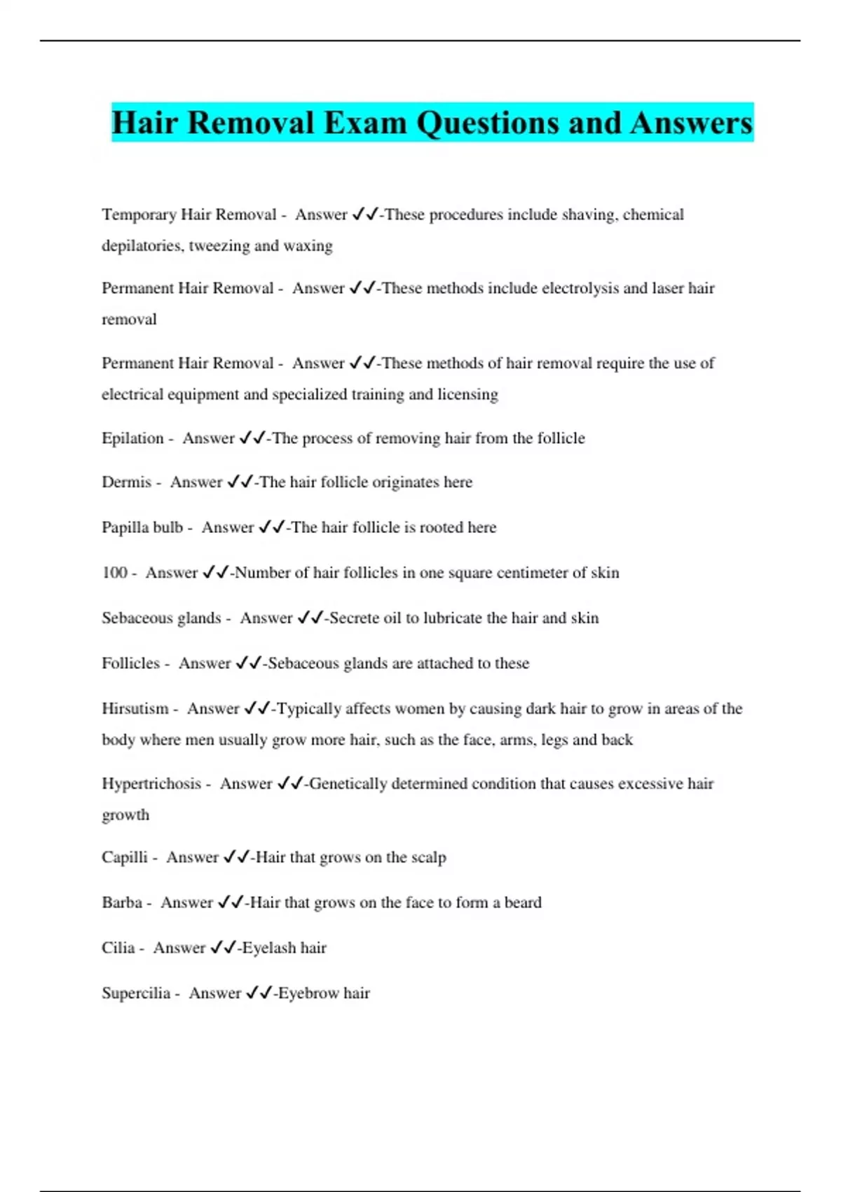 Temporary Hair Removal - Answer ️️-These procedures include shaving, chemical depilatories, tweezing and waxing Permanent Hair Removal - Answer ️️-These methods include electrolysis and laser hair removal
