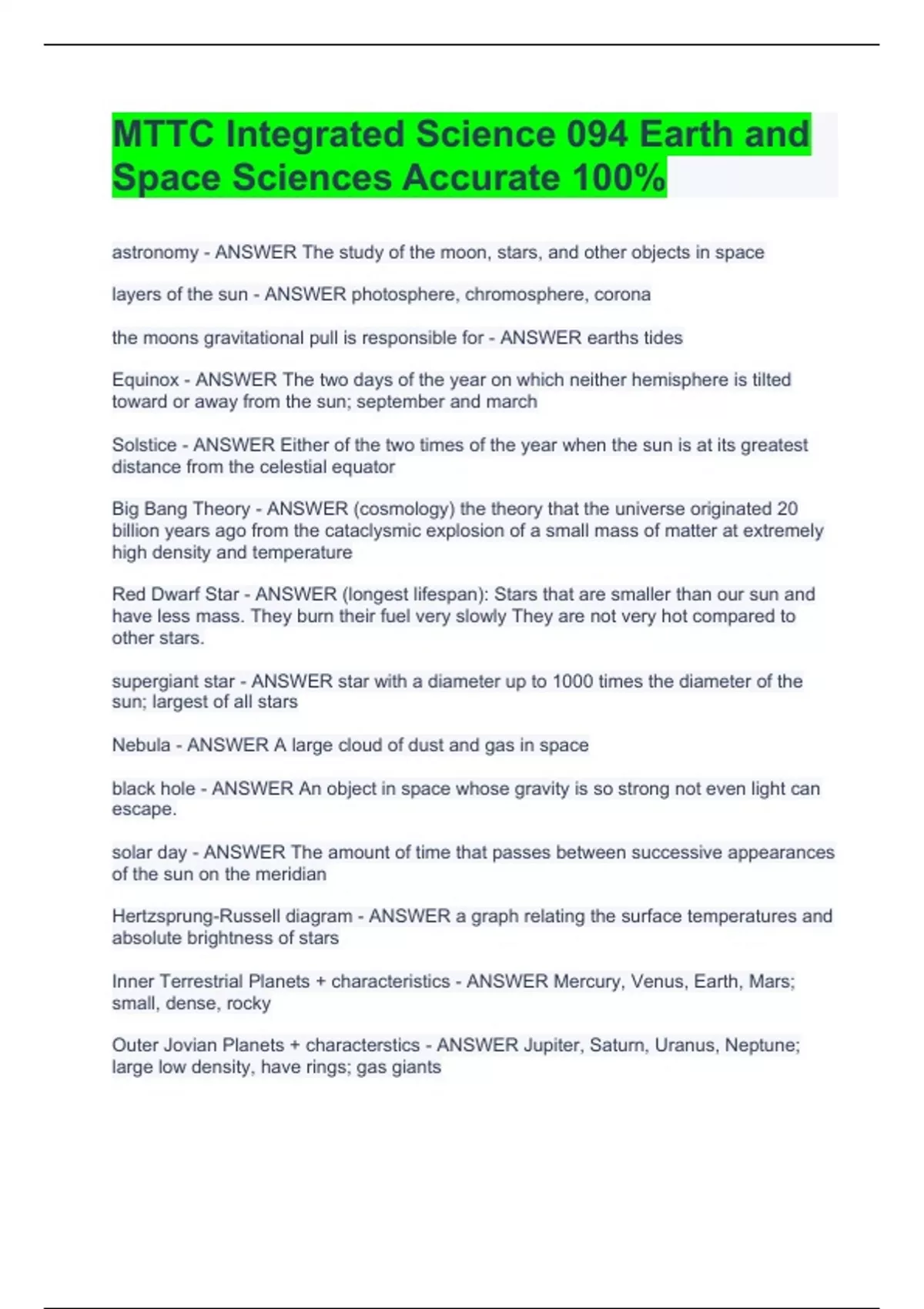 astronomy - ANSWER The study of the moon, stars, and other objects in space layers of the sun - ANSWER photosphere, chromosphere, corona the moons gravitational pull is responsible for - ANSWER earths tides Equinox - ANSWER The two days of the year on which neither hemisphere is tilted toward or away from the sun; september and march Solstice - ANSWER Either of the two times of the year when the sun is at its greatest distance from the celestial equator Big Bang Theory - ANSWER (cosmology) the theory that the universe originated 20 billion years ago from the cataclysmic explosion of a small mass of matter at extremely high density and temperature Red Dwarf Star - ANSWER (longest lifespan): Stars that are smaller than our sun and have less mass. They burn their fuel very slowly They are not very hot compared to other stars. supergiant star - ANSWER star with a diameter up to 1000 times the diameter of the sun; largest of all stars Nebula - ANSWER A large cloud of dust and gas in space black hole - ANSWER An object in space whose gravity is so strong not even light can escape. solar day - ANSWER The amount of time that passes between successive appearances of the sun on the meridian Hertzsprung-Russell diagram - ANSWER a graph relating the surface temperatures and absolute brightness of stars Inner Terrestrial Planets + characteristics - ANSWER Mercury, Venus, Earth, Mars; small, dense, rocky Outer Jovian Planets + characterstics - ANSWER Jupiter, Saturn, Uranus, Neptune; large low density, have rings; gas giants