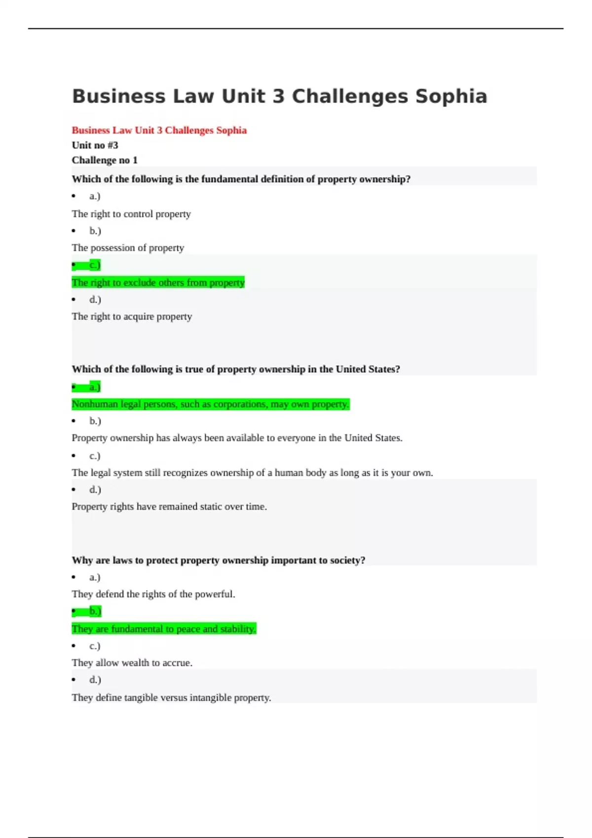 Business Law Unit 3 Challenges Sophia Business Law Unit 3 Challenges Sophia Unit no #3 Challenge no 1 Which of the following is the fundamental definition of property ownership? · a.) The right to control property · b.) The possession of property · c.) The right to exclude others from property · d.) The right to acquire property Which of the following is true of property ownership in the United States? · a.) Nonhuman legal persons, such as corporations, may own property. · b.) Property ownership has always been available to everyone in the United States. · c.) The legal system still recognizes ownership of a human body as long as it is your own. · d.) Property rights have remained static over time. Why are laws to protect property ownership important to society? · a.) They defend the rights of the powerful. · b.) They are fundamental to peace and stability. · c.) They allow wealth to accrue. · d.) They define tangible versus intangible property