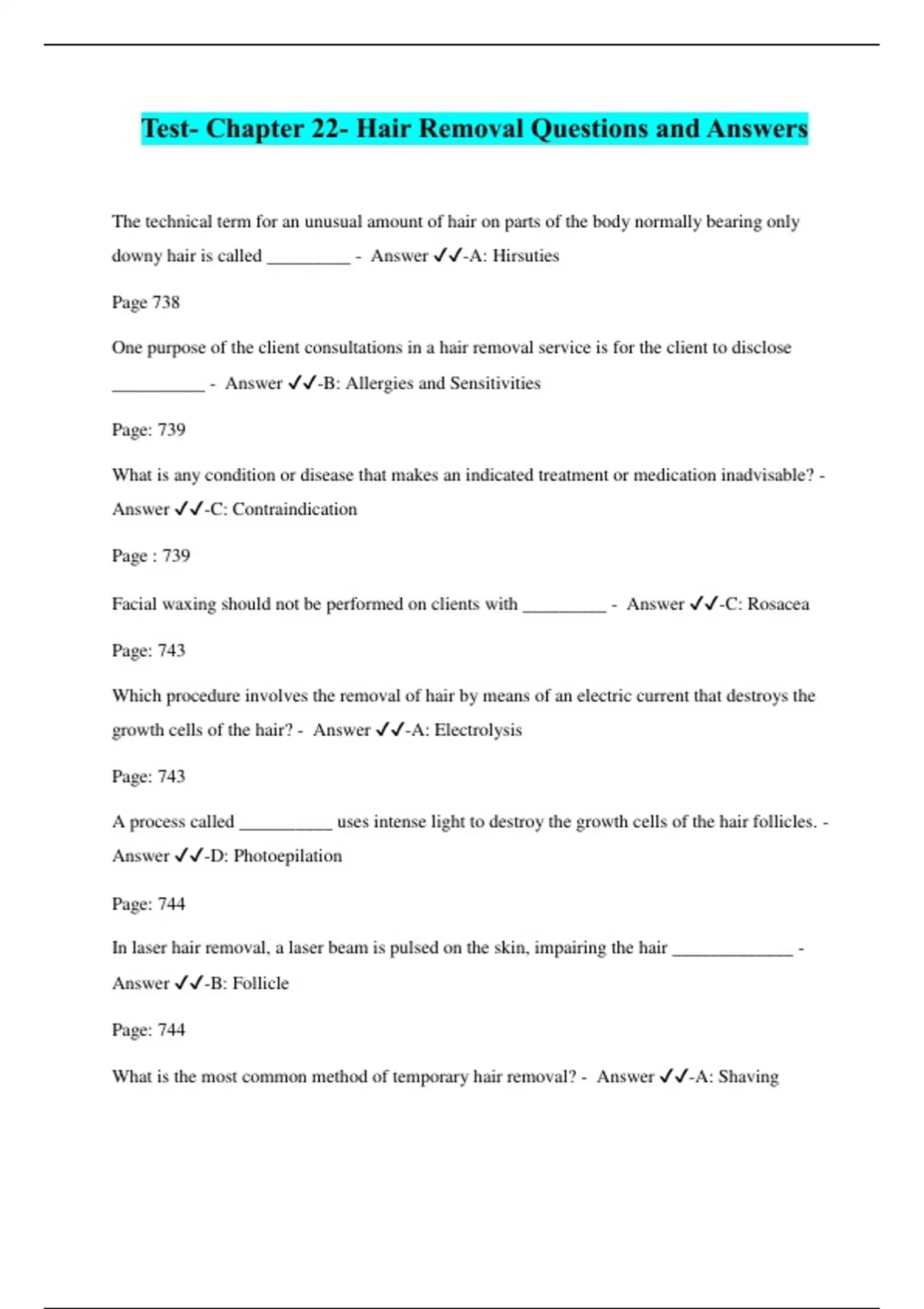 The technical term for an unusual amount of hair on parts of the body normally bearing only downy hair is called _________ - Answer ️️-A: Hirsuties Page 738 One purpose of the client consultations in a hair removal service is for the client to disclose __________ - Answer ️️-B: Allergies and Sensitivities
