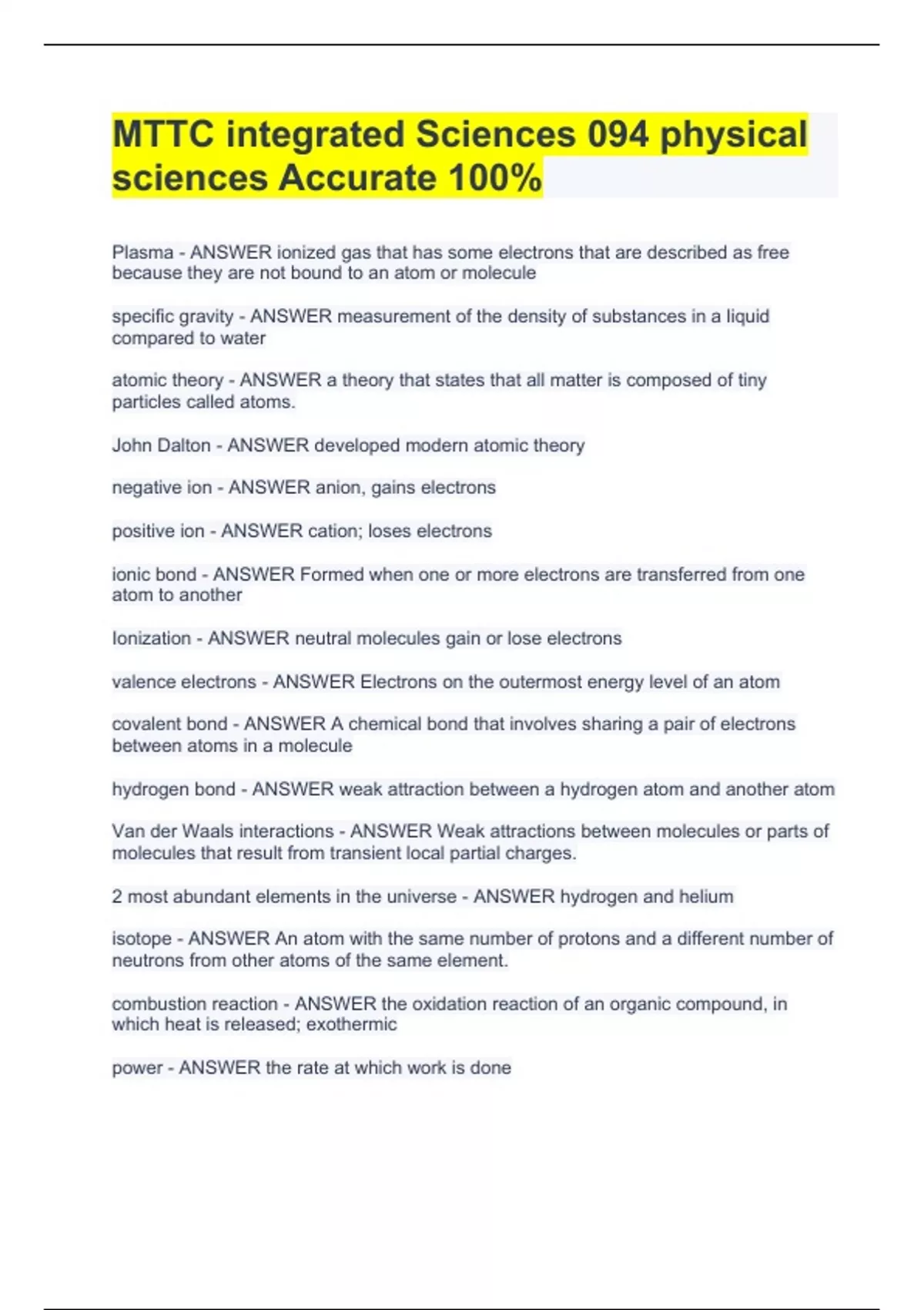 Plasma - ANSWER ionized gas that has some electrons that are described as free because they are not bound to an atom or molecule specific gravity - ANSWER measurement of the density of substances in a liquid compared to water atomic theory - ANSWER a theory that states that all matter is composed of tiny particles called atoms. John Dalton - ANSWER developed modern atomic theory negative ion - ANSWER anion, gains electrons positive ion - ANSWER cation; loses electrons ionic bond - ANSWER Formed when one or more electrons are transferred from one atom to another Ionization - ANSWER neutral molecules gain or lose electrons valence electrons - ANSWER Electrons on the outermost energy level of an atom covalent bond - ANSWER A chemical bond that involves sharing a pair of electrons between atoms in a molecule hydrogen bond - ANSWER weak attraction between a hydrogen atom and another atom Van der Waals interactions - ANSWER Weak attractions between molecules or parts of molecules that result from transient local partial charges. 2 most abundant elements in the universe - ANSWER hydrogen and helium isotope - ANSWER An atom with the same number of protons and a different number of neutrons from other atoms of the same element. combustion reaction - ANSWER the oxidation reaction of an organic compound, in which heat is released; exothermic power - ANSWER the rate at which work is done work - ANSWER quantity of energy transferred by a force when it is applied to a body and causes that body to move in the direction of the force