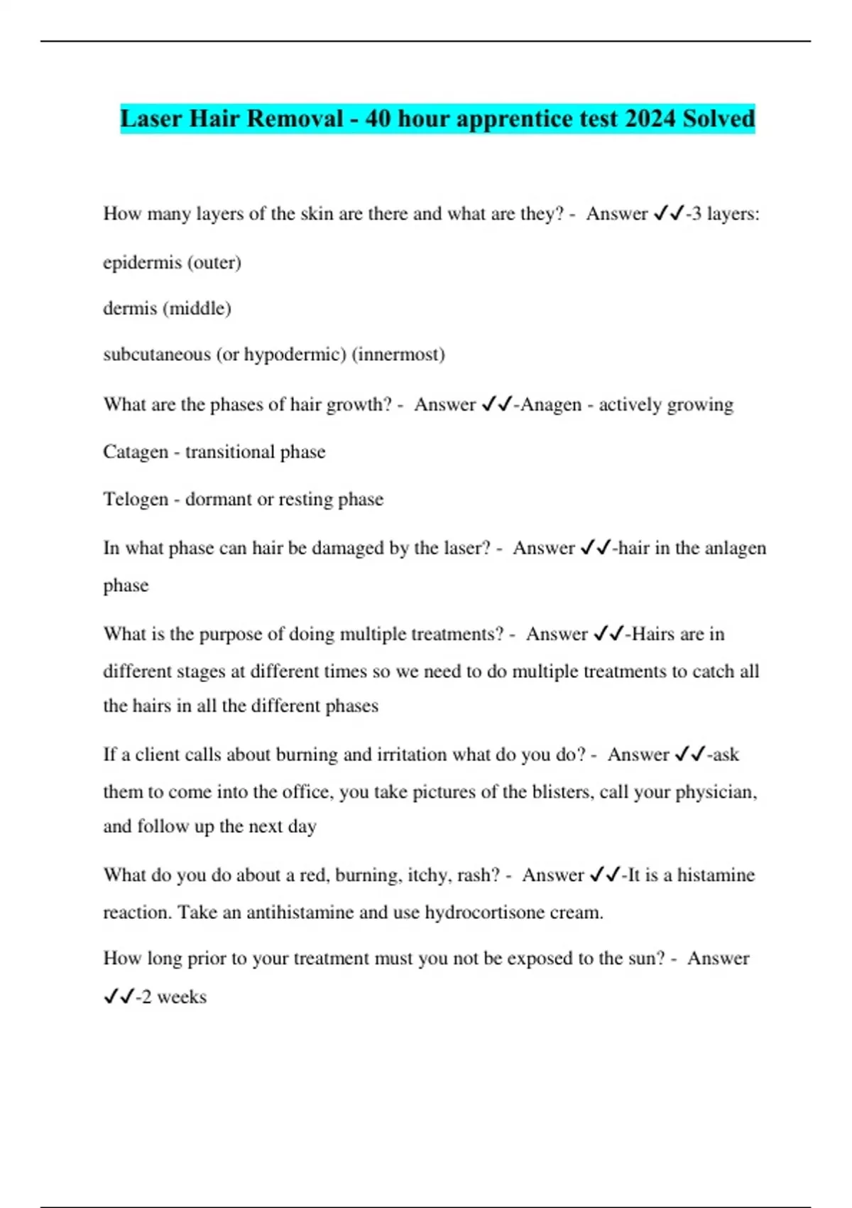 Laser Hair Removal - 40 hour apprentice test 2024 Solved